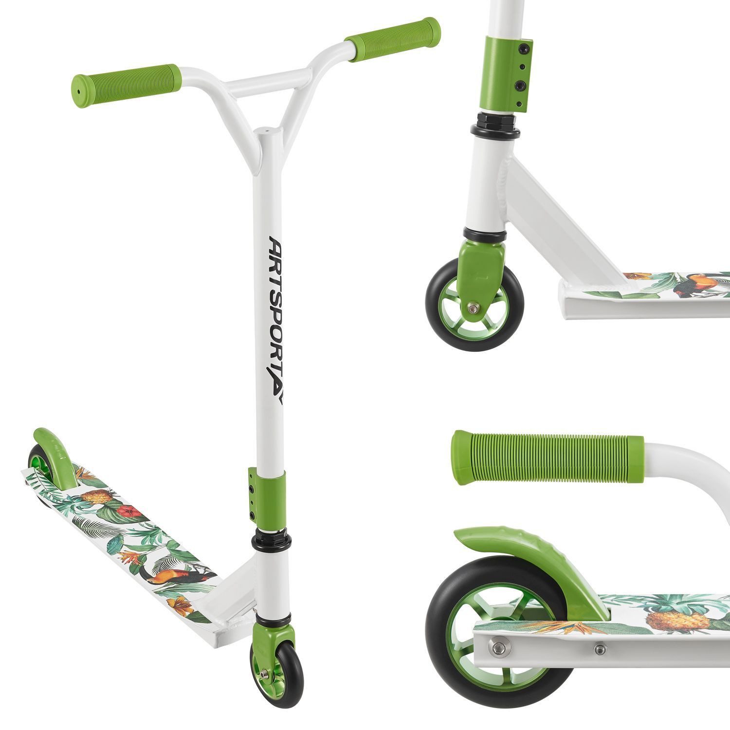 Der trendige Scooter wird zum echten Hingucker im Park. Die ansprechenden Farben, Muster und bunten Räder begeistern Mädchen und Jungs. Das stylische Deck-Muster überzeugt in angesagter Street Style Optik. Auch praktisch: Der Stunt Roller ist zum Teil vormontiert und somit in Kürze einsatzbereit.