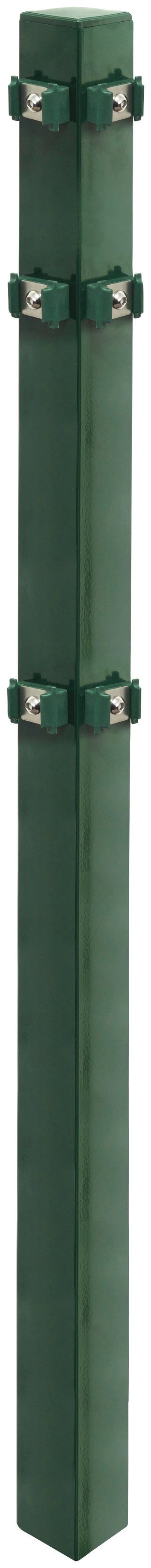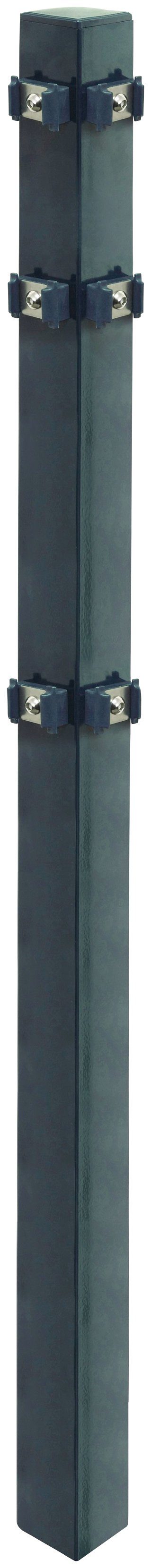 Der Eckpfosten aus verzinktem Metall ist durch Phosphatierung und Pulverbeschichtung optimal gegen Rost geschützt. Er eignet sich für einen klassischen Gartenzaun aus Einzel- oder Doppelstabmatten und wird inklusive Halterungen und Befestigungsmaterial geliefert.