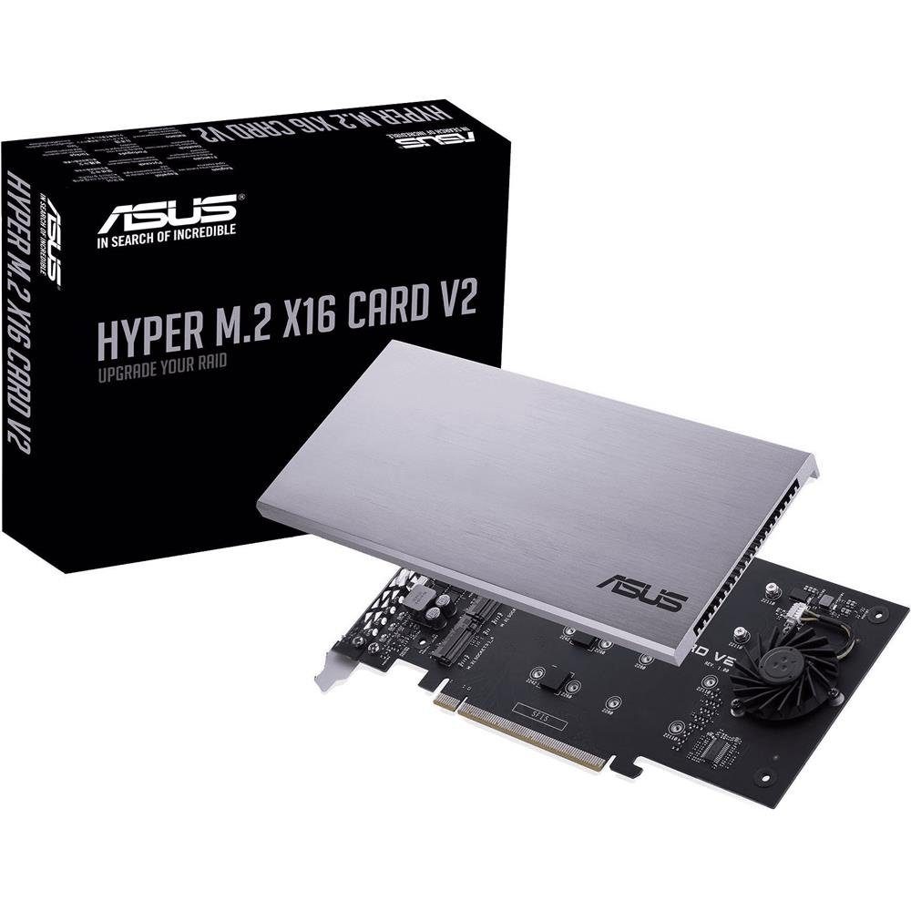 Nicht verwendete CPU PCle-Lanes können dem Speicher zugewiesen werden, sodass Sie ein bootfähiges RAID-Array mit mehreren M. 2-SSDs erstellen können. Die ASUS Hyper M. 2 x16 V2-Karte bietet vier M. 2-Steckplätze, über die Sie Ihr System mit leistungsstarkem SSD-Speicher erweitern können. Die Karte wurde für die neueste Generation von NVMe-Laufwerken entwickelt und bietet ein verbessertes Netzteil mit einer Leistung von bis zu 14 W pro Laufwerk sowie einen großen Kühlkörper und einen aktiven Lüfter, damit die Laufwerke für eine optimale Leistung kühl bleiben. Hyper M. 2 x16 wurde speziell für Intel Virtual RAID on CPU (VROC) und die AMD Ryzen Threadripper -Plattform für NVMe RAID-Unterstützung entwickelt und bietet vier M. 2-Steckplätze mit einer Bandbreite von bis zu 128 Gbit / s pro Karte. LED & Taste: 1 x M.2 FAN Netzschalter; 4 x M.2 Zugangs-LEDs.