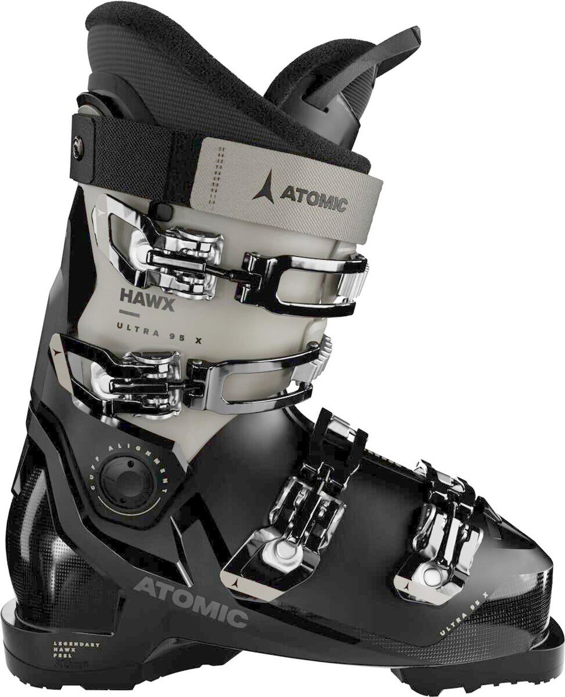 Der Atomic Hawx Ultra 95X W GW ist der ideale Alpinskischuh für All-Mountain-Fahrerinnen und bietet das legendäre Fahrgefühl und die Performance der Hawx Linie in Form eines kompakten Skischuhs mit 98mm schmalem Leisten. Basis der Prolite Technologie ist ein sehr dünnes Profil mit Verstärkungen an den Schlüsselstellen. Das Ergebnis ist ein leichter und zugleich stabiler Skischuh mit mittelhartem 95er-Flex. Sein 3D Silver Innenschuh bietet mit seinem vorgeformten 3D-Fit an Knöchel und Ferse eine sofortige anatomische Passform, außerdem können Schale, Manschette und Innenschuh per Memory Fit weiter auf die individuelle Fußform abgestimmt werden. Die asymmetrisch vorgeformte 3D Stretch Zehenbox lässt dem großen Zeh etwas mehr Platz und sorgt so für erstklassigen Komfort. Und die anpassbare Manschettenkonstruktion hat einen herausnehmbaren Spoiler, mit dem du das Volumen variieren kannst. Cantable GripWalk Pads bieten optimierten Grip beim Gehen und zugleich die Kraftübertragung herkömmlicher Alpinsohlen.