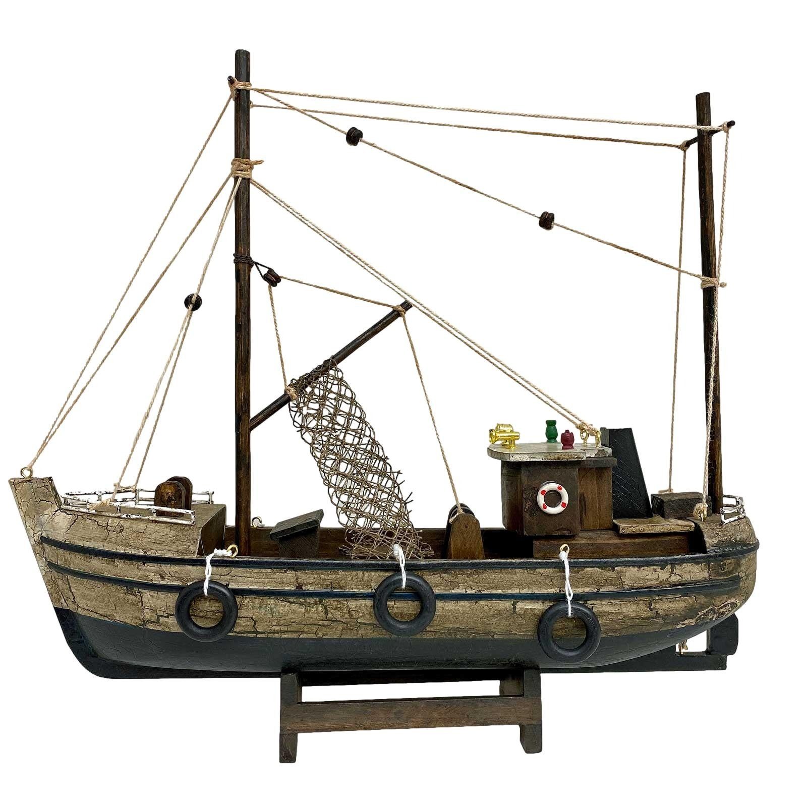 Wunderschönes Modell eines Schiffskutters aus Holz, nach altem Vorbild gefertigt. Das Schiff ist komplett montiert. Es ist kein Bausatz. Segel und Masten werden zum Versand abgenommen, in einigen Minuten sind diese Teile aufgebaut und ein prachtvolles Schiff steht vor Ihnen. Wie auf den Fotos zu sehen, eine hochwertige und dekorative Arbeit im antiken Stil. Durch aufwendige Handarbeit wird der Artikel traditionell bearbeitet, um ein antikes Erscheinungsbild zu erhalten. Jedes Objekt hat leichte Abweichungen. Die Maße lauten wie folgt: Maße: 30 x 26 x 8,5cm (B x H x T). Das Gewicht beträgt 400g. Der Artikel ist nur zu Dekozwecken geeignet und somit kein Kinderspielzeug. Dieses Produkt ist nur für Sammler gedacht, die mindestens 14 Jahre alt sind.