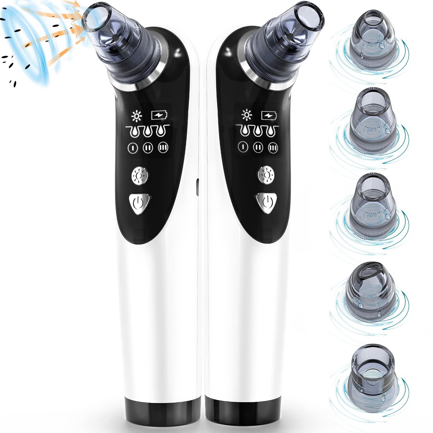 5 austauschbare Saugaufsätze Der Mitesser-Entferner hat insgesamt 5 austauschbare Saugköpfe. Zwei mittelgroße runde Saugköpfe sind für die Nase, Wangen und andere Gesichtsbereiche außerhalb der Augenpartie geeignet. Ein elliptischer Saugkopf ist für die Glättung von Falten geeignet. Ein großer runder Saugkopf ist für den Gesichtsbereich geeignet, mit Ausnahme der Augenpartie. Der becherförmige Saugkopf ist zur Linderung von Körpermüdigkeit gedacht und sollte nicht im Gesicht verwendet werden.