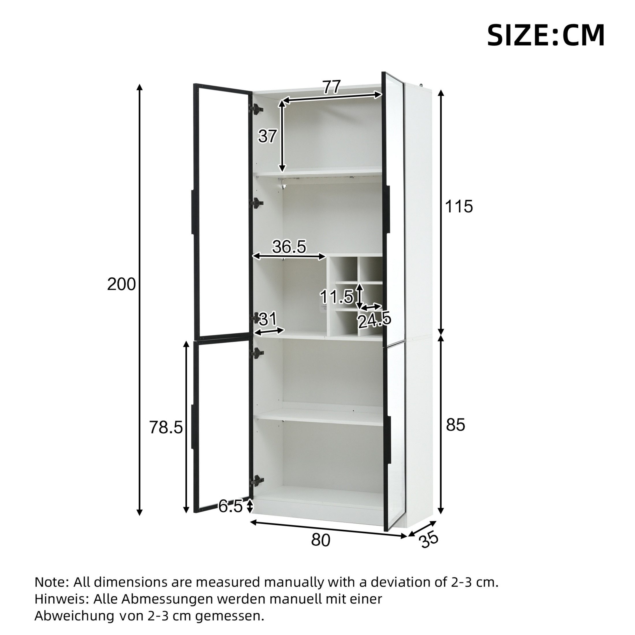 Hergestellt aus robusten Spanplatten mit einer Gesamttragfähigkeit von 80 kg. Jede Ebene trägt Bücher, Geschirr oder Dekoration sicher. Das Möbelstück kann im Wohnzimmer als Vitrine oder Bücherregal dienen, in der offenen Küche als Vorratsschrank oder Weinschrank – für verschiedene Szenarien geeignet.