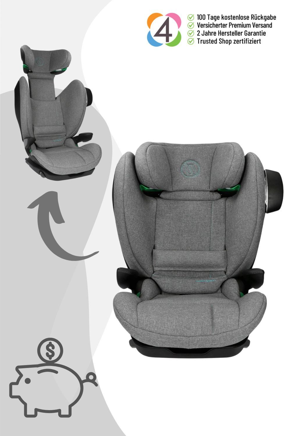 Dank meiner einhändig höhenverstellbaren Kopfstütze und der praktischen Einstellanzeige kann ich individuell an die Körpergröße Eures Kindes angepasst werden. Die Rückenneigung lässt sich bis zur Ruhestellung einstellen, was eine entspannte Position im Schlaf ermöglicht und die Halswirbelsäule schont.