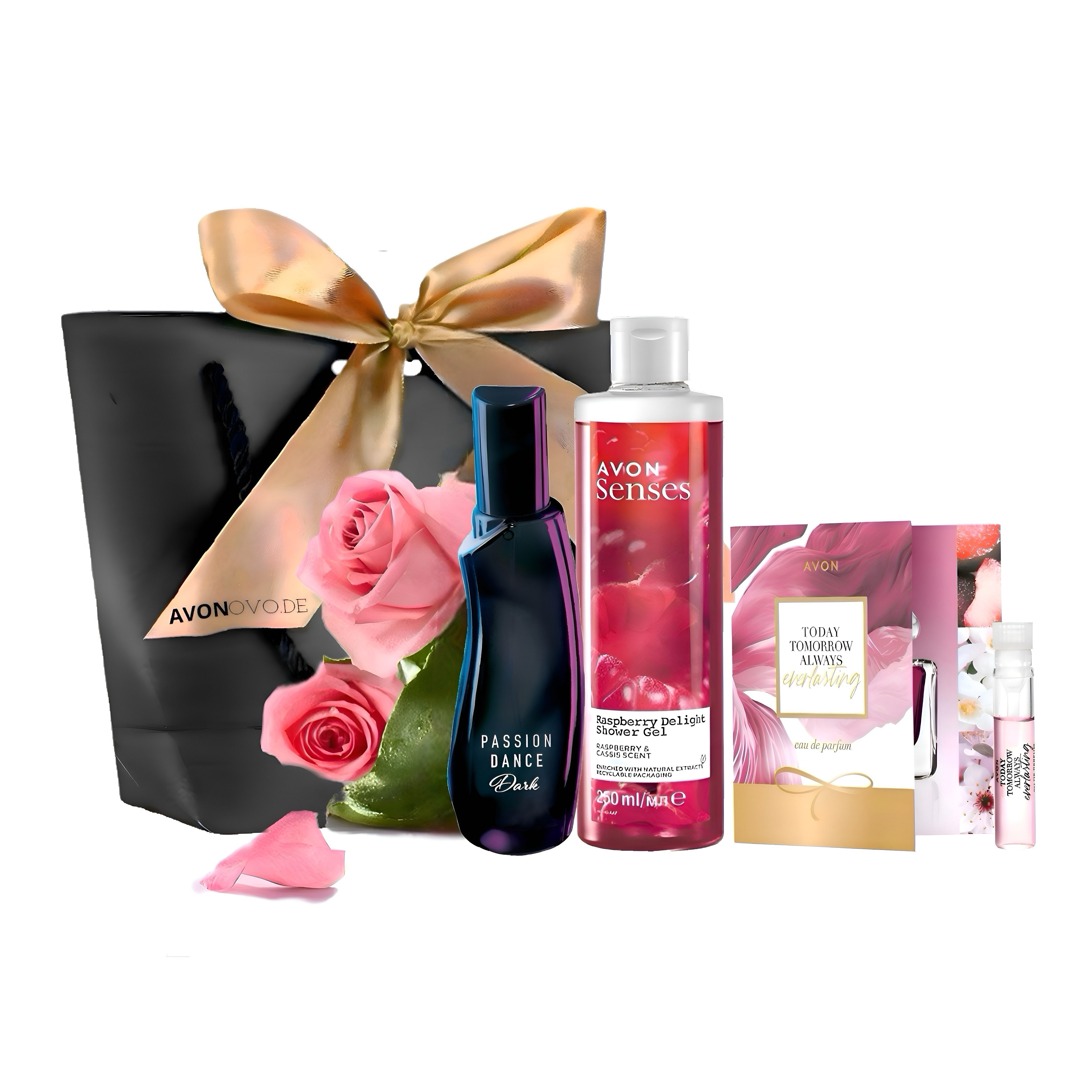 Lieferumfang | PASSION DANCE DARK Eau de Toilette 50 ml, RASPBERRY Duschgel 250 ml, Duftprobe, elegante schwarze Geschenktasche mit goldener Schleife |