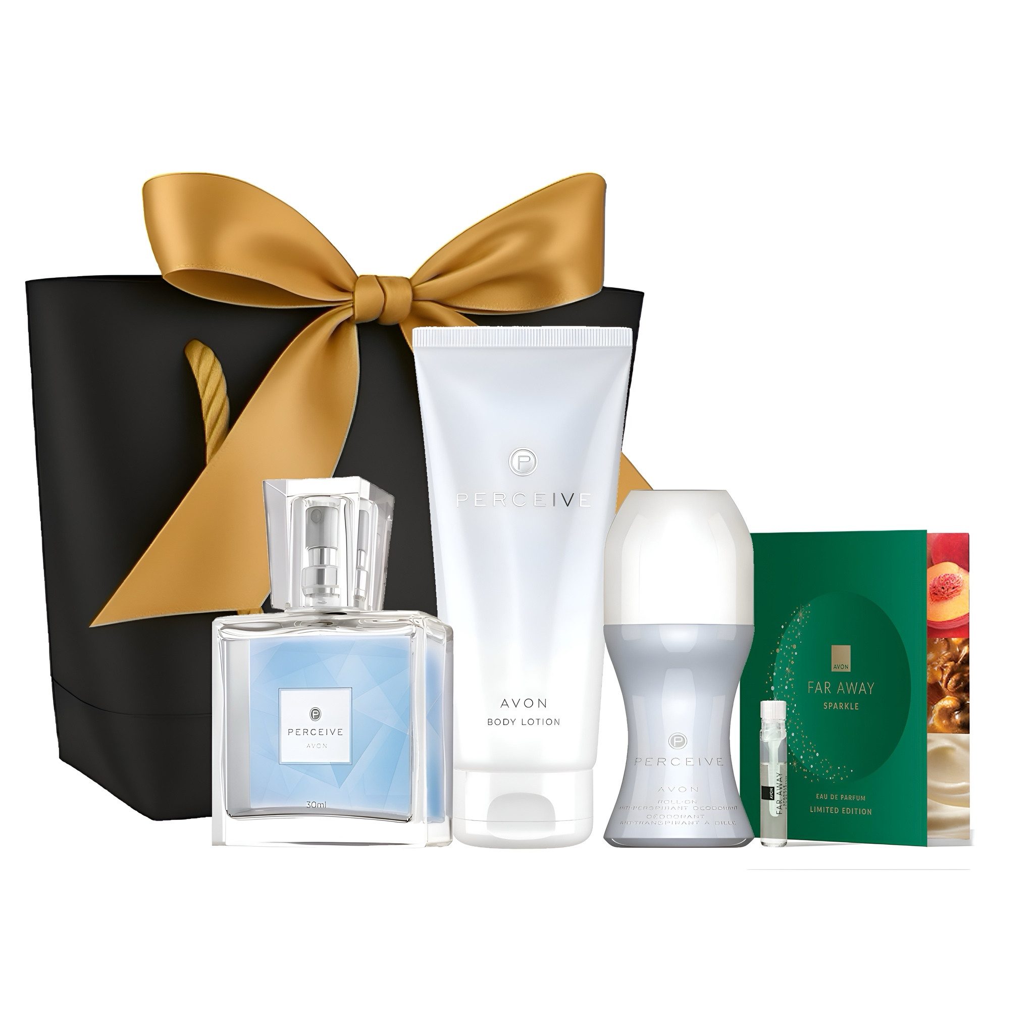 Lieferumfang | 1 × Perceive Eau de Parfum 30 ml 1 × Perceive Bodylotion 125 ml 1 × Perceive Deoroller 50 ml 1 × Duftprobe 1 × Geschenkbeutel schwarz mit goldener Schleife |
