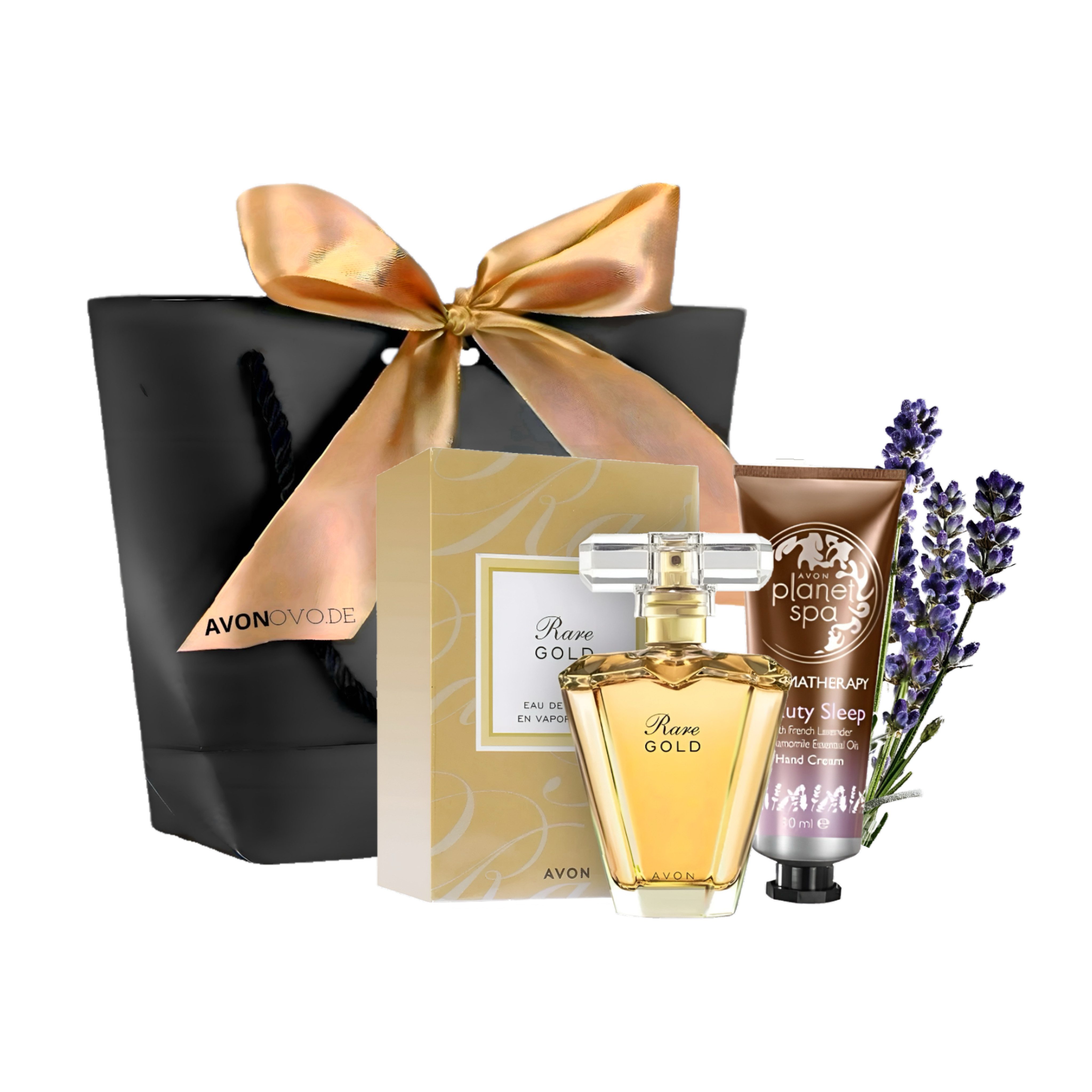 Lieferumfang | Im Set enthalten sind: • Avon Rare Gold Eau de Parfum 50 ml • Eine elegante Geschenktasche • Eine zufällig ausgewählte Duftprobe Planet Spa AROMATHERAPY "Schönheitsschlaf" Handcreme |