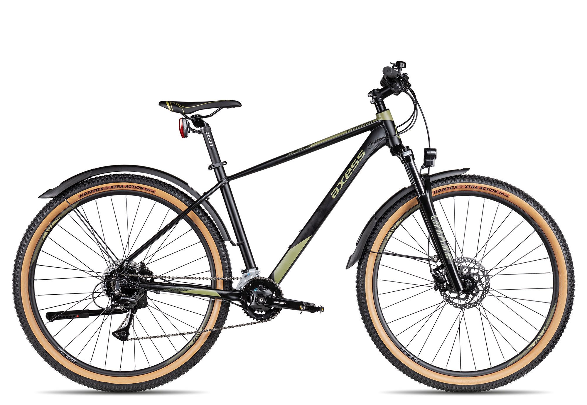 Mit seiner komfortablen Rahmengeometrie und der StVZO-konformen Ausstattung ab Werk, bietet sich das Axess Keedo EQP All-Terrain-Bike für entspannte Feldwegstouren und Alltagsfahrten durch die Stadt gleichermaßen an. Passenden Grip geben dir dabei die 2,25 Zoll Hartex Skinwall-Reifen, die auch auf festeren Wegen ein ordentliches Abrollverhalten bieten. Je nach Rahmenhöhe bekommst du stabile Axess Laufräder in 27,5 oder 29 Zoll. So erhältst du eine optimale Kombination aus Rahmen- und Radgröße.