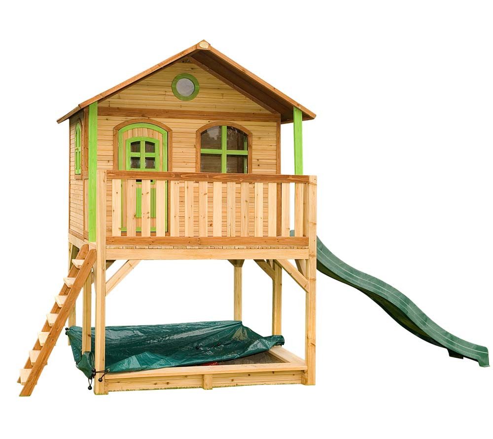 Hochwertiges Kinderspielhaus inkl. Anbau auf Stelzen in natürlichem Design. Stabile Wände aus behandeltem Holz (15 mm) und 38mm starker Rahmenkonstruktion. Die zu öffnenden Fenster und die große Eingangstür sorgt für eine schöne Spielatmosphäre. Wird inklusive Sandkasten + Abdeckung zum Schutz gegen Tiere geliefert.