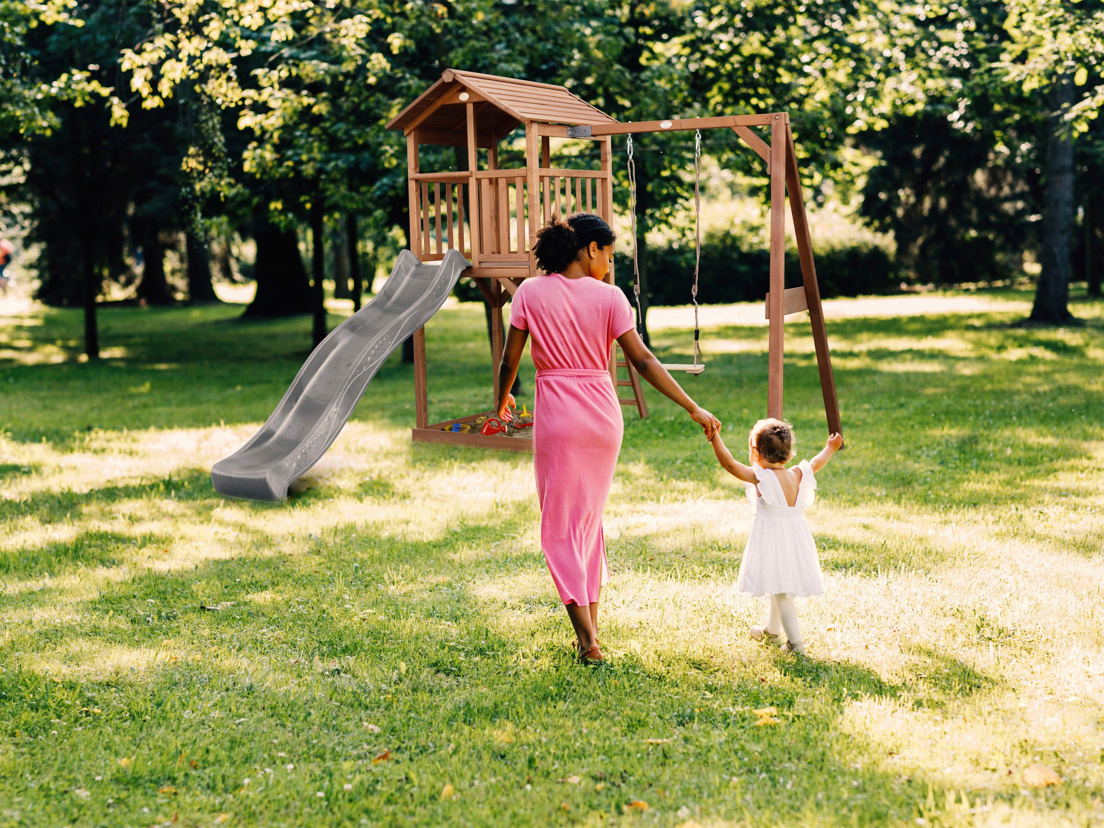 Im AXI Beach Tower Spielturm mit Einzelschaukel Braun sieht es so aus, als wären Ihre Kinder in einem echten Strandhaus. Klettern und Rutschen sind die Lieblingsbeschäftigungen der kleinen Kinder. Und das ist mit diesem Beach Tower alles möglich. Herrlich, dass Kinder an einem schönen, sonnigen Tag stundenlang das genießen können. Sie können die Treppe in den Turm hinaufsteigen. Von dort aus haben sie einen schönen Blick auf den gesamten Garten. Zeit, wieder nach unten zu gehen? Dann rutschen sie schnell und einfach der langen Rutsche hinunter. Unter dem Spielturm befindet sich ein Sandkasten, in dem sie alle Sandkuchen backen können. Neben dem Blick vom Turm aus können sie beim Schaukeln ihre Freiheit genießen. Das braune Holz gibt diesem Spielturm ein Aussehen, was zu jedem Garten passt. Der Beach Tower Spielturm hat eine Plattformhöhe von 117,5 cm und ist mit einer 228 cm langen Großrutsche ausgestattet. Die AXI "Beach" Serie besteht aus verschiedenen Spieltürmen mit vielen Möglichkeiten. Es gibt Spieltürme mit oder ohne Klettergerüst und Schaukel(n). Die Spieltürme können auch mit verschiedenen AXI Accessoires wie Tafel, Briefkasten, Fernglas oder Blumenkasten erweitert werden. Der Beach Tower besteht aus FSC® 100% Hemlockholz und stammt ebenfalls aus bewirtschafteten Wäldern. Diese Holzart splittert nicht und ist von Natur aus resistent gegen Witterungseinflüsse wie Regen und damit resistent gegen Verrottung. Das Holz wird mit einem wasserbasierten Beize behandelt und ist daher nahezu wartungsfrei. Dieser Beize ist nicht schädlich und für Kinder unbedenklich (ohne Chemikalien). Mit einer Garantiezeit von 10 Jahren können Sie und Ihre Kinder jahrelang unbeschwert genießen. Abmessungen Der Beach Tower Spielturm hat eine Plattformhöhe von 118 cm und eine Gesamthöhe von 241,9 cm. Das Spielhaus ist 349 cm lang und 283,6 cm breit. Mit einer Innengröße von 85 x 89 cm und einer Firsthöhe von ca. 125 cm ist Beach Tower ein mittelgroßer Holz Spielturm. Einfache Montage AXI Spieltürme bestehen aus vormontierten (Prefab) Paneelen. Die Teile sind in der Regel vorgebohrt, so dass das Haus im Handumdrehen aufgebaut werden kann. Multifunktionaler Spielturm mit einem schönen offenen Konzept. Ideal für die Entwicklung von Gleichgewicht, Koordination und Kraft. Ein höhenverstellbare Schaukelsitz aus Holz. Einschließlich 2 Bodenanker für zusätzliche Stabilität und Sicherheit. Kann mit einer Kletterwand und einem Klettergerüst erweitert werden. FSC® 100% Hemlockholz, aus bewirtschafteten Wäldern. Hemlock splittert nicht und ist von Natur aus resistent gegen Witterungseinflüsse wie Regen und damit resistent gegen Verrottung. Einfache Montage durch die vormontierten Teile (Prefab Paneelen). Mit einem wasserbasierten Beize behandelt, ohne Chemikalien. 117,5 cm hohe Plattform mit Leiter. Große graue Rutsche von 228 cm mit Wasseranschluss. Sandkasten geeignet für ca. 125 kg Sand. Maximales Gewicht: 150 kg für den Turm und 150 kg für die Schaukel. Übersichtliche Bedienungsanleitung. Geeignet für Kinder ab 3 Jahre. 10 Jahre Garantie! Abmessungen Außenmaße (LxBxH): 349 x 283,6 x 241,9 cm Innenmaße (LxBxH): 85 x 89 x 97-125 cm Plattformhöhe: 117,5 cm Sandkasten Außenmaße (LxBxH): 105 x 101 x 10 cm Innenmaße (LxBxH): 101 x 97 x 10 cm Optionales Zubehör A030.077.00 - Verankerungssatz C051.176.00 - Kletterwand A025.184.02 - Klettergerüste C051.007.01 - Kreidetafel A031.019.02 - 3-teiliges Picknick-Set A031.019.12 - 2-teiliges Picknickhocker-Set.