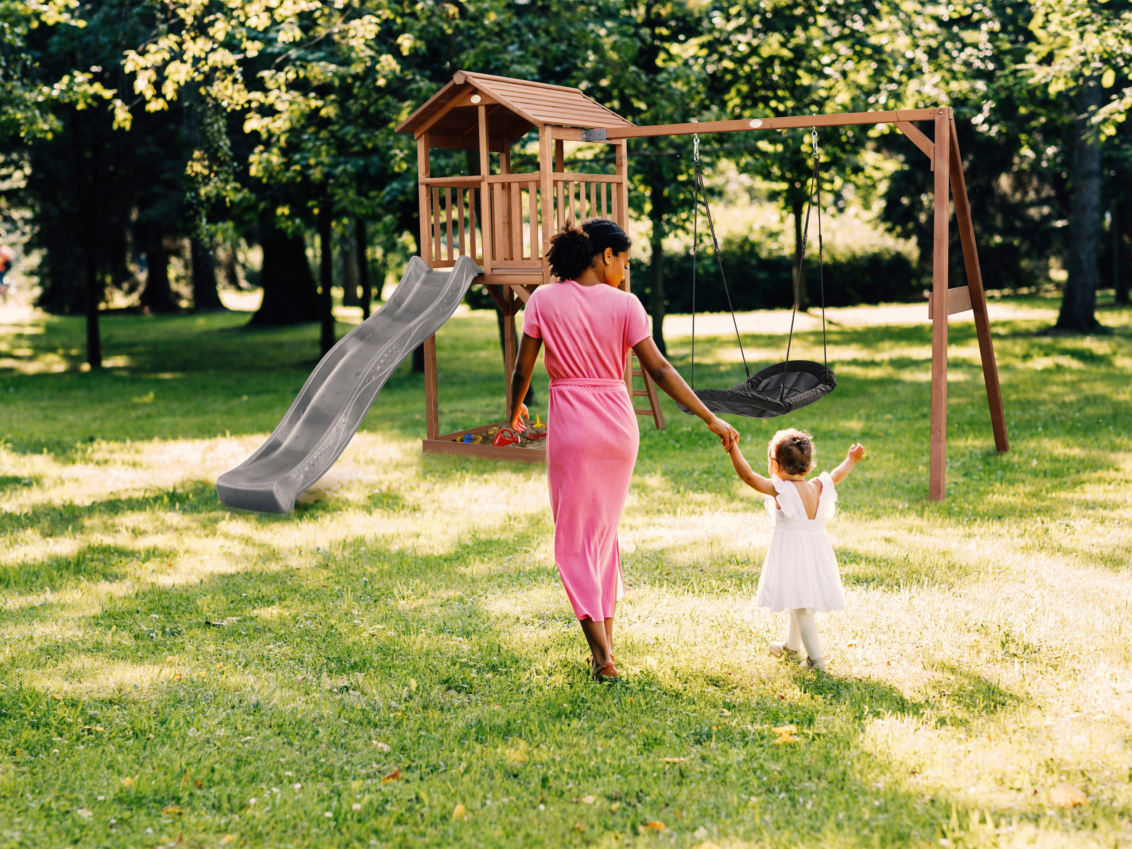 Im AXI Beach Tower Spielturm mit Roxy Nestschaukel Braun sieht es so aus, als wären Ihre Kinder in einem echten Strandhaus. Klettern und Rutschen sind die Lieblingsbeschäftigungen der kleinen Kinder. Und das ist mit diesem Beach Tower alles möglich. Herrlich, dass Kinder an einem schönen, sonnigen Tag stundenlang das genießen können. Sie können die Treppe in den Turm hinaufsteigen. Von dort aus haben sie einen schönen Blick auf den gesamten Garten. Zeit, wieder nach unten zu gehen? Dann rutschen sie schnell und einfach der langen Rutsche hinunter. Unter dem Spielturm befindet sich ein Sandkasten, in dem sie alle Sandkuchen backen können. Neben dem Blick vom Turm aus können sie beim Schaukeln ihre Freiheit genießen. Zum Glück müssen sie nicht alleine schaukeln, aber es ist auch gleichzeitig mit deinem Freund oder deiner Freundin möglich. Der extra große Sitzbereich des Roxy vermittelt den Eindruck, dass sich Ihre Kinder in einem Schaukelboot befinden, was den Spaß noch größer macht! Das braune Holz gibt diesem Spielturm ein natürliches Aussehen, was zu jedem Garten passt. Der Beach Tower Spielturm hat eine Plattformhöhe von 117,5 cm und ist mit einer 228 cm langen Großrutsche ausgestattet. Roxy Nestschaukel Die Roxy Nestschaukel hat schwarze geflochtene Seile, die der Nestschaukel ein schönes Aussehen geben und in der Höhe leicht verstellbar sind. Der Stahlrahmen ist rundum gepolstert, um einen weichen Stoß zu gewährleisten. Das Stoffmaterial ist sowohl robust, als auch angenehm in der Handhabung. Das Wasser kann leicht wegfließen. Die Ringe und Stellachten bestehen aus verzinktem Stahl. Die Schweißstellen an den Seilen sind aus schwarzem PP gefertigt. Abmessungen Der Beach Tower Spielturm hat eine Plattformhöhe von 118 cm und eine Gesamthöhe von 241,9 cm. Das Spielhaus ist 349 cm lang und 356,6 cm breit. Mit einer Innengröße von 85 x 89 cm und einer Firsthöhe von ca. 125 cm ist Beach Tower ein mittelgroßer Holz Spielturm. Einfache Montage AXI Spieltürme bestehen aus vormontierten (Prefab) Paneelen. Die Teile sind in der Regel vorgebohrt, so dass das Haus im Handumdrehen aufgebaut werden kann. Roxy Nestschaukel ist leicht höhenverstellbar. Einschließlich 2 Bodenanker für zusätzliche Stabilität und Sicherheit. Kann mit einer Kletterwand und einem Klettergerüst erweitert werden. Einfache Montage durch die vormontierten Teile (Prefab Paneelen). Mit einem wasserbasierten Beize behandelt, ohne Chemikalien. 117,5 cm hohe Plattform mit Leiter. Große blaue Rutsche von 228 cm mit Wasseranschluss. Sandkasten geeignet für ca. 125 kg Sand. Maximales Gewicht: 150 kg für den Turm und 150 kg für die Schaukel. Abmessungen Außenmaße (LxBxH): 349 x 356,6 x 241,9 cm Innenmaße (LxBxH): 85 x 89 x 97-125 cm Plattformhöhe: 117,5 cm Abmessungen Nestschaukel (LxB): 170 x 70 cm Sandkasten Außenmaße (LxBxH): 105 x 101 x 10 cm Innenmaße (LxBxH): 101 x 97 x 10 cm.