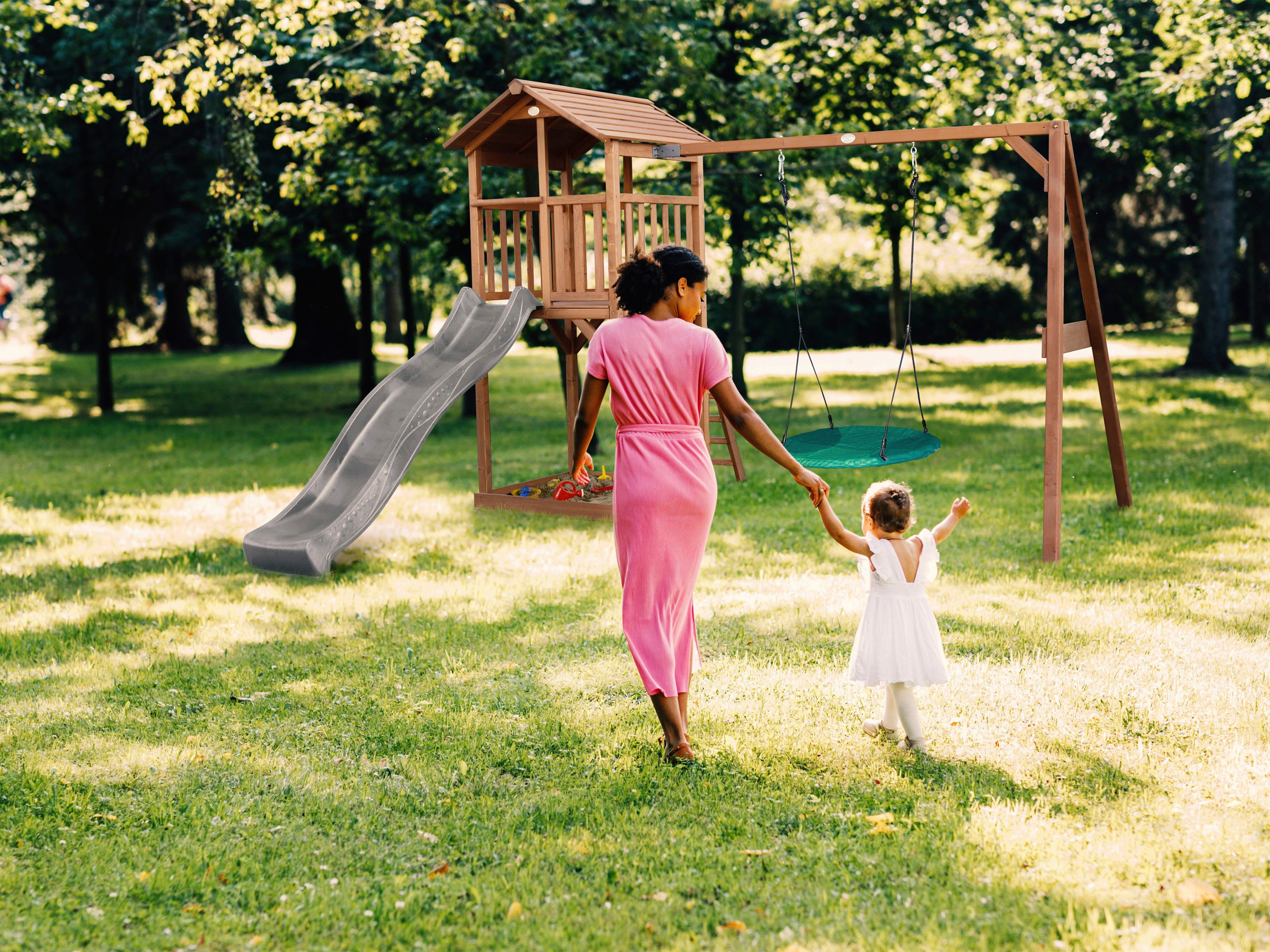 Im AXI Beach Tower Spielturm mit Summer Nestschaukel Braun sieht es so aus, als wären Ihre Kinder in einem echten Strandhaus. Klettern und Rutschen sind die Lieblingsbeschäftigungen der kleinen Kinder. Und das ist mit diesem Beach Tower alles möglich. Herrlich, dass Kinder an einem schönen, sonnigen Tag stundenlang das genießen können. Sie können die Treppe in den Turm hinaufsteigen. Von dort aus haben sie einen schönen Blick auf den gesamten Garten. Zeit, wieder nach unten zu gehen? Dann rutschen sie schnell und einfach der langen Rutsche hinunter. Unter dem Spielturm befindet sich ein Sandkasten, in dem sie alle Sandkuchen backen können. Neben dem Blick vom Turm aus können sie beim Schaukeln ihre Freiheit genießen. Zum Glück müssen sie nicht alleine schaukeln, aber es ist auch gleichzeitig mit deinem Freund oder deiner Freundin möglich. Das braune Holz gibt diesem Spielturm ein natürliches Aussehen, was zu jedem Garten passt. Der Beach Tower Spielturm hat eine Plattformhöhe von 117,5 cm und ist mit einer 228 cm langen Großrutsche ausgestattet. Summer Nestschaukel Die Summer Nestschaukel Grün hat schwarze geflochtene Seile, die sich leicht in der Höhe verstellen lassen. Der Stahlrahmen ist rundum gepolstert, um einen weichen Aufprall zu gewährleisten. Das Gewebematerial ist sowohl stark als auch angenehm zu berühren. Das Wasser kann leicht wegfließen. Die Ringe und Stellachten bestehen aus verzinktem Stahl. Die Schweißstellen an den Seilen sind aus schwarzem PP gefertigt. Der Beach Tower besteht aus FSC 100% Hemlockholz und stammt ebenfalls aus bewirtschafteten Wäldern und ist daher auch eine Wahl. Diese Holzart splittert nicht und ist von Natur aus resistent gegen Witterungseinflüsse wie Regen und damit resistent gegen Verrottung. Das Holz wird mit einem wasserbasierten Beize behandelt und ist daher nahezu wartungsfrei. Dieser Beize ist nicht schädlich und für Kinder unbedenklich (ohne Chemikalien). Abmessungen Der Beach Tower Spielturm hat eine Plattformhöhe von 118 cm und eine Gesamthöhe von 241,9 cm. Das Spielhaus ist 349 cm lang und 356,6 cm breit. Mit einer Innengröße von 85 x 89 cm und einer Firsthöhe von ca. 125 cm ist Beach Tower ein mittelgroßer Holz Spielturm. Einfache Montage AXI Spieltürme bestehen aus vormontierten (Prefab) Paneelen. Die Teile sind in der Regel vorgebohrt, so dass das Haus im Handumdrehen aufgebaut werden kann. Summer Nestschaukel ist leicht höhenverstellbar. Einschließlich 2 Bodenanker für zusätzliche Stabilität und Sicherheit. Kann mit einer Kletterwand und einem Klettergerüst erweitert werden. Einfache Montage durch die vormontierten Teile (Prefab Paneelen). Mit einem wasserbasierten Beize behandelt, ohne Chemikalien. 117,5 cm hohe Plattform mit Leiter. Große blaue Rutsche von 228 cm mit Wasseranschluss. Sandkasten geeignet für ca. 125 kg Sand. Maximales Gewicht: 150 kg für den Turm und 150 kg für die Schaukel. Abmessungen Außenmaße (LxBxH): 349 x 356,6 x 241,9 cm Innenmaße (LxBxH): 85 x 89 x 97-125 cm Plattformhöhe: 117,5 cm Nestschaukeldurchmesser: Ø 100 cm Sandkasten Außenmaße (LxBxH): 105 x 101 x 10 cm Innenmaße (LxBxH): 101 x 97 x 10 cm.