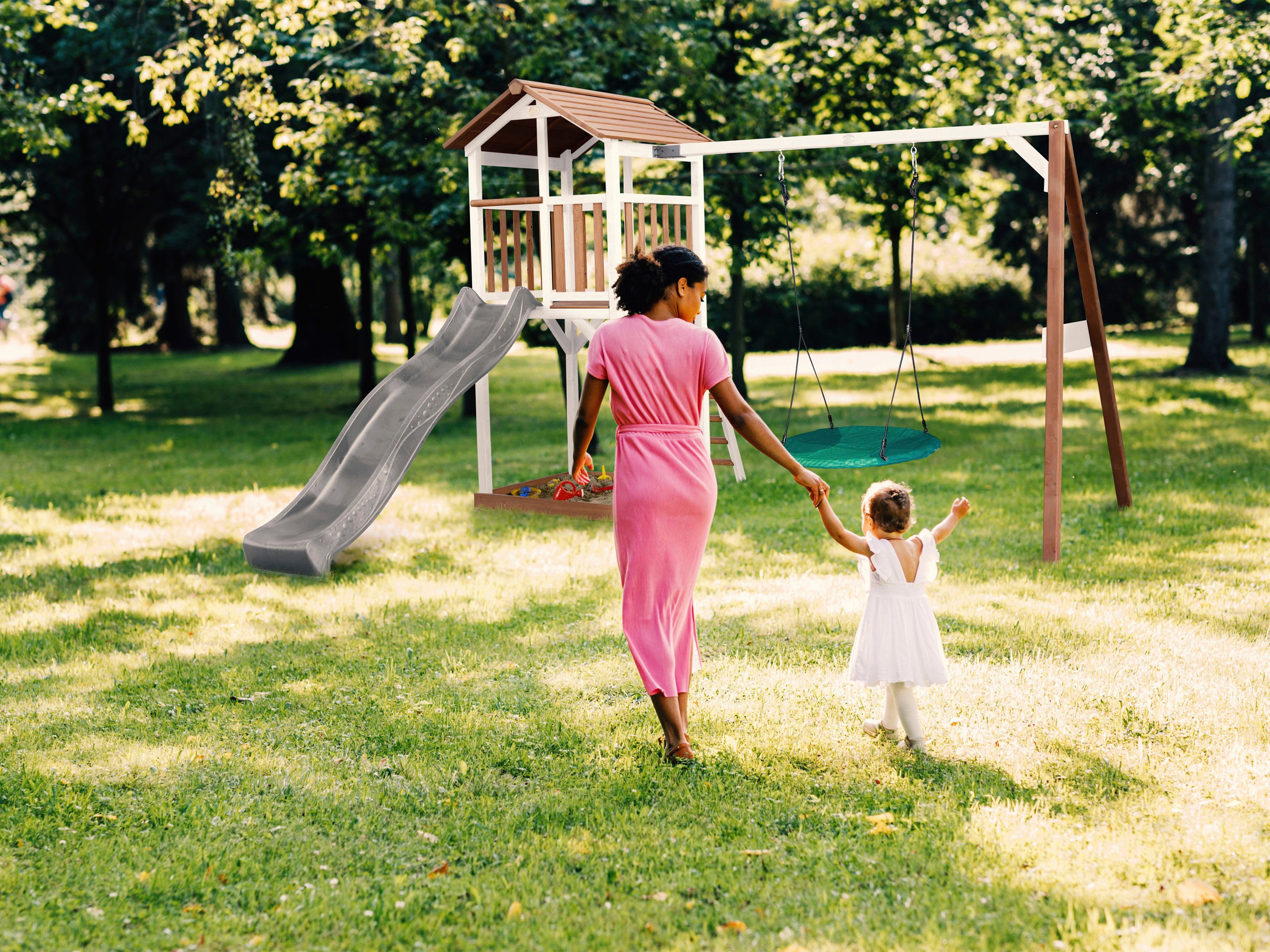Im AXI Beach Tower Spielturm mit Summer Nestschaukel Braun/weiß sieht es so aus, als wären Ihre Kinder in einem echten Strandhaus. Klettern und Rutschen sind die Lieblingsbeschäftigungen der kleinen Kinder. Und das ist mit diesem Beach Tower alles möglich. Herrlich, dass Kinder an einem schönen, sonnigen Tag stundenlang das genießen können. Sie können die Treppe in den Turm hinaufsteigen. Von dort aus haben sie einen schönen Blick auf den gesamten Garten. Zeit, wieder nach unten zu gehen? Dann rutschen sie schnell und einfach der langen Rutsche hinunter. Unter dem Spielturm befindet sich ein Sandkasten, in dem sie alle Sandkuchen backen können. Neben dem Blick vom Turm aus können sie beim Schaukeln ihre Freiheit genießen. Zum Glück müssen sie nicht alleine schaukeln, aber es ist auch gleichzeitig mit deinem Freund oder deiner Freundin möglich. Die Kombination aus weiß/braunem Holz gibt dieser Spielturm ein sommerliches Aussehen, was zu jedem Garten passt. Der Beach Tower Spielturm hat eine Plattformhöhe von 117,5 cm und ist mit einer 228 cm langen Großrutsche ausgestattet. Summer Nestschaukel Die Summer Nestschaukel Grün hat schwarze geflochtene Seile, die sich leicht in der Höhe verstellen lassen. Der Stahlrahmen ist rundum gepolstert, um einen weichen Aufprall zu gewährleisten. Das Gewebematerial ist sowohl stark als auch angenehm zu berühren. Das Wasser kann leicht wegfließen. Die Ringe und Stellachten bestehen aus verzinktem Stahl. Die Schweißstellen an den Seilen sind aus schwarzem PP gefertigt. Abmessungen Der Beach Tower Spielturm hat eine Plattformhöhe von 118 cm und eine Gesamthöhe von 241,9 cm. Das Spielhaus ist 349 cm lang und 356,6 cm breit. Mit einer Innengröße von 85 x 89 cm und einer Firsthöhe von ca. 125 cm ist Beach Tower ein mittelgroßer Holz Spielturm. Sicherheit Die Spieltürme von AXI wurden nach den Sicherheitsnormen der EN 71 getestet und produziert, um sicheren Spielspaß zu gewährleisten. Einfache Montage AXI Spieltürme bestehen aus vormontierten (Prefab) Paneelen. Die Teile sind in der Regel vorgebohrt, so dass das Haus im Handumdrehen aufgebaut werden kann. Summer Nestschaukel ist leicht höhenverstellbar. Einschließlich 2 Bodenanker für zusätzliche Stabilität und Sicherheit. Kann mit einer Kletterwand und einem Klettergerüst erweitert werden. Einfache Montage durch die vormontierten Teile (Prefab Paneelen). Mit einem wasserbasierten Beize behandelt, ohne Chemikalien. 117,5 cm hohe Plattform mit Leiter. Große blaue Rutsche von 228 cm mit Wasseranschluss. Sandkasten geeignet für ca. 125 kg Sand. Maximales Gewicht: 150 kg für den Turm und 150 kg für die Schaukel. Abmessungen Außenmaße (LxBxH): 349 x 356,6 x 241,9 cm Innenmaße (LxBxH): 85 x 89 x 97-125 cm Plattformhöhe: 117,5 cm Nestschaukeldurchmesser: Ø 100 cm Sandkasten Außenmaße (LxBxH): 105 x 101 x 10 cm Innenmaße (LxBxH): 101 x 97 x 10 cm.