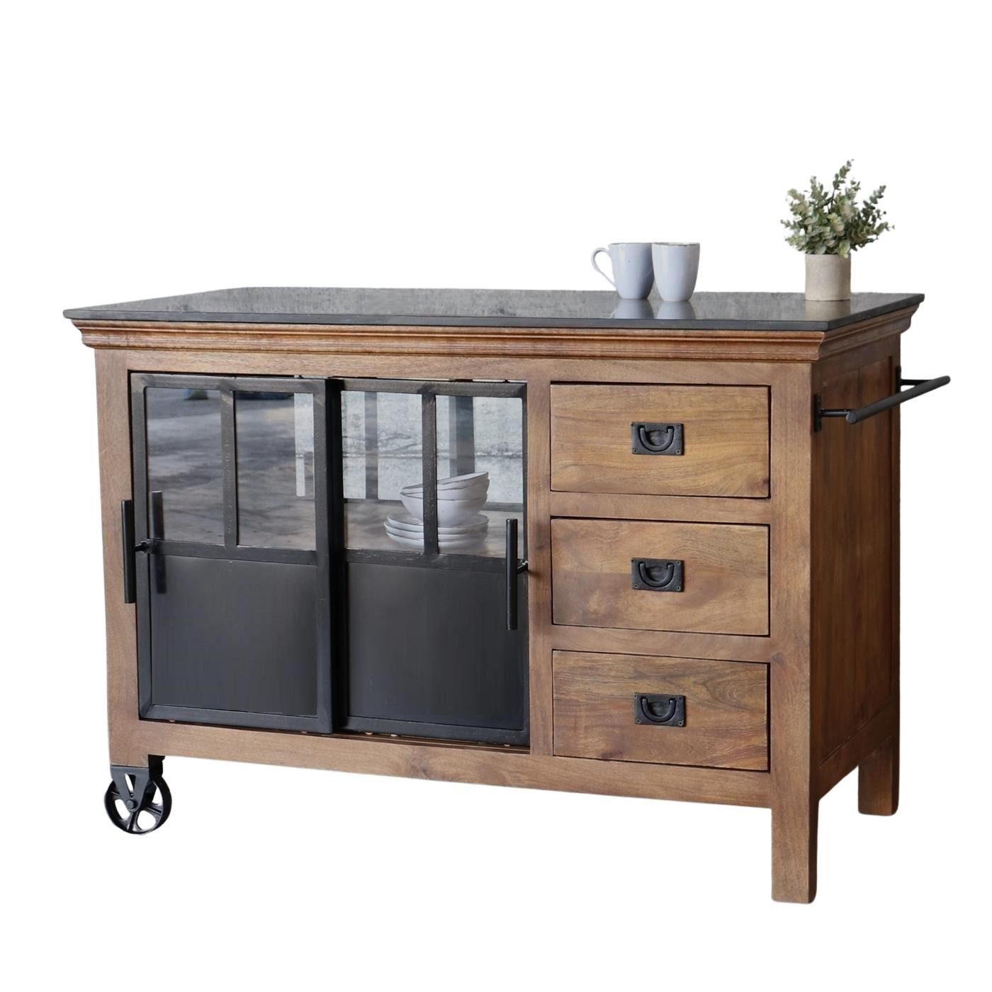 Das perfekte Arbeitszentrum in der Küche oder dem Esszimmer. Rundum begehbar und von beiden Seiten bedienbar bietet der prachtvolle Küchenblock auf Rollen ausreichend Stauraum. Dank der 3 großen Schubladen sowie Stauraum hinter Schiebetüren finden eine ganze Menge Utensilien zum Kochen oder Grillen Platz. Die solide Verarbeitung aus massivem Mangoholz, Schiebetüren aus Eisen sowie einer edlen Tischplatte aus Marmor wird Sie tätlich begeistern. Dieses schöne Möbelstück bringt nicht nur einen hohen Nutzwert sondern auch einen unverwechselbaren Charme in Ihre Einrichtung. Eine ideale Erweiterung des Arbeitsbereiches in der Küche.