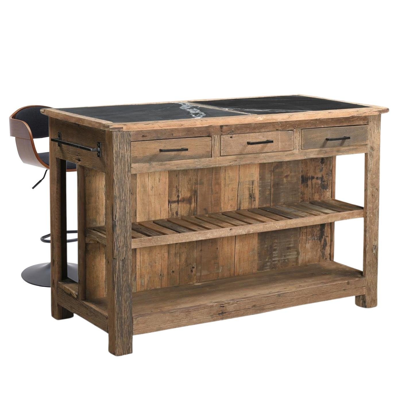 Die extravagante Kücheninsel mit Marmorplatte, Theke, Sitzgelegenheit & Essplatz überzeugt Liebhaber gehobener Wohnkultur auf den ersten Blick. Der Korpus aus massivem, recyceltem Altholz harmoniert optisch perfekt mit der Arbeitsplatte aus robustem Marmor. Das Altholz der freistehenden Kücheninsel ist ausgestattet mit sichtbaren Maserungen, Verwitterung und Furchen. Die hochwertige Versiegelung der Holzfläche macht dieses prachtvollen Küchenarbeitstisch dennoch alltagstauglich. Das gelegentliche auskehren mit einem Handbesten reicht völlig aus. Eine ideale freistehende Kücheninsel für Ihren Küchenbereich, Terrasse oder die Sommerküche im Gartenhaus. Die drei großen Schubladen und zwei offenen Staufächer bieten ausreichend Platz für Geschirr, Vorräte oder Grillutensilien. Auf der Rückseite eingesetzte Hocker oder Stühle reichen aus um diesen Küchenarbeitstisch als edlen Essplatz nutzen zu können.