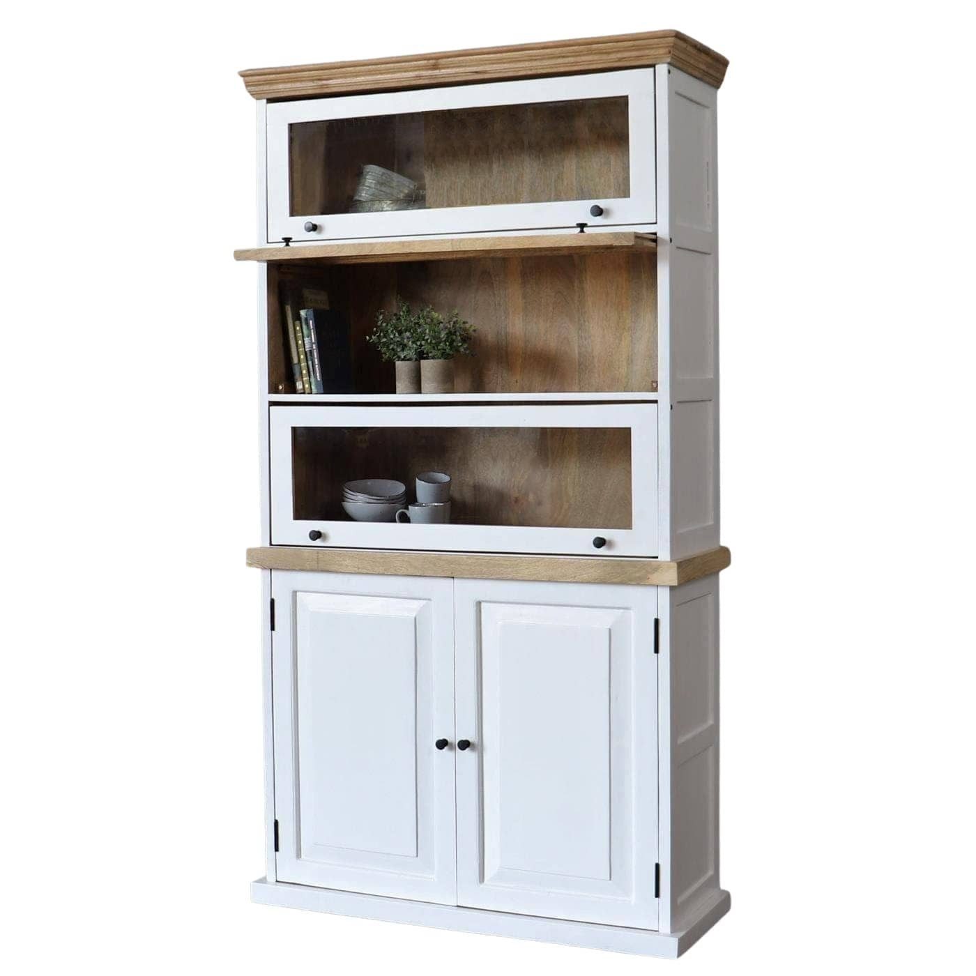Mit einem Handgriff öffnen sich die eleganten Klapptüren nach oben und verschwinden praktischerweise im Korpus. Die prachtvolle Vitrine im Landhaus Vintage Design bietet mit seinen Regalfächern ausreichend Platz für Bücher, Geschirr oder sonstige Utensilien. Egal ob Wohnzimmer, Küche oder Esszimmer - mit dieser edlen Vitrine holen Sie sich ein Schmuckstück nach Hause. Sehr hochwertig in der Verarbeitung und im Design. Die natürliche Maserung des Massivholzes in Kombination mit Glas fügt sich in jeden Einrichtungsstil ein. Das aufwendig angebrachte Antik-Finish überzeugt auf ganzer Linie. Hochwertige Massivbauweise die über Generationen hinweg begeistert und ausreichend Stauraum anbietet. Ein Highlight in jedem Interieur das sich mit jedem Einrichtungsstil kombinieren lässt.