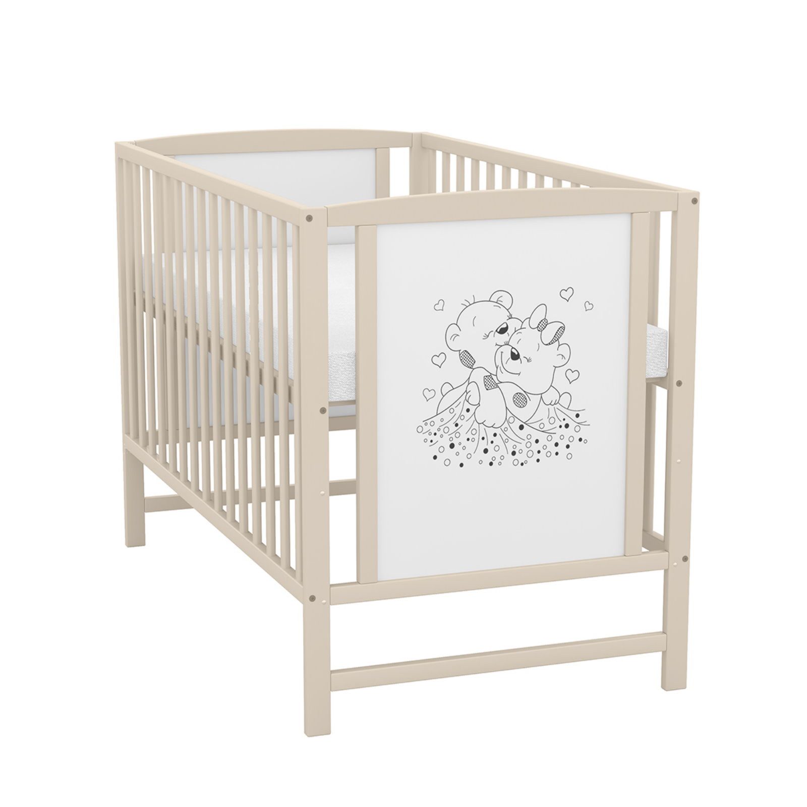 Die beiden süßen Teddybären mit kleinen Herzchen, die auf den Stirnseiten des Bettes abgebildet sind, verleihen dem Gitterbett eine liebevolle Note und schaffen eine freundliche Atmosphäre.
