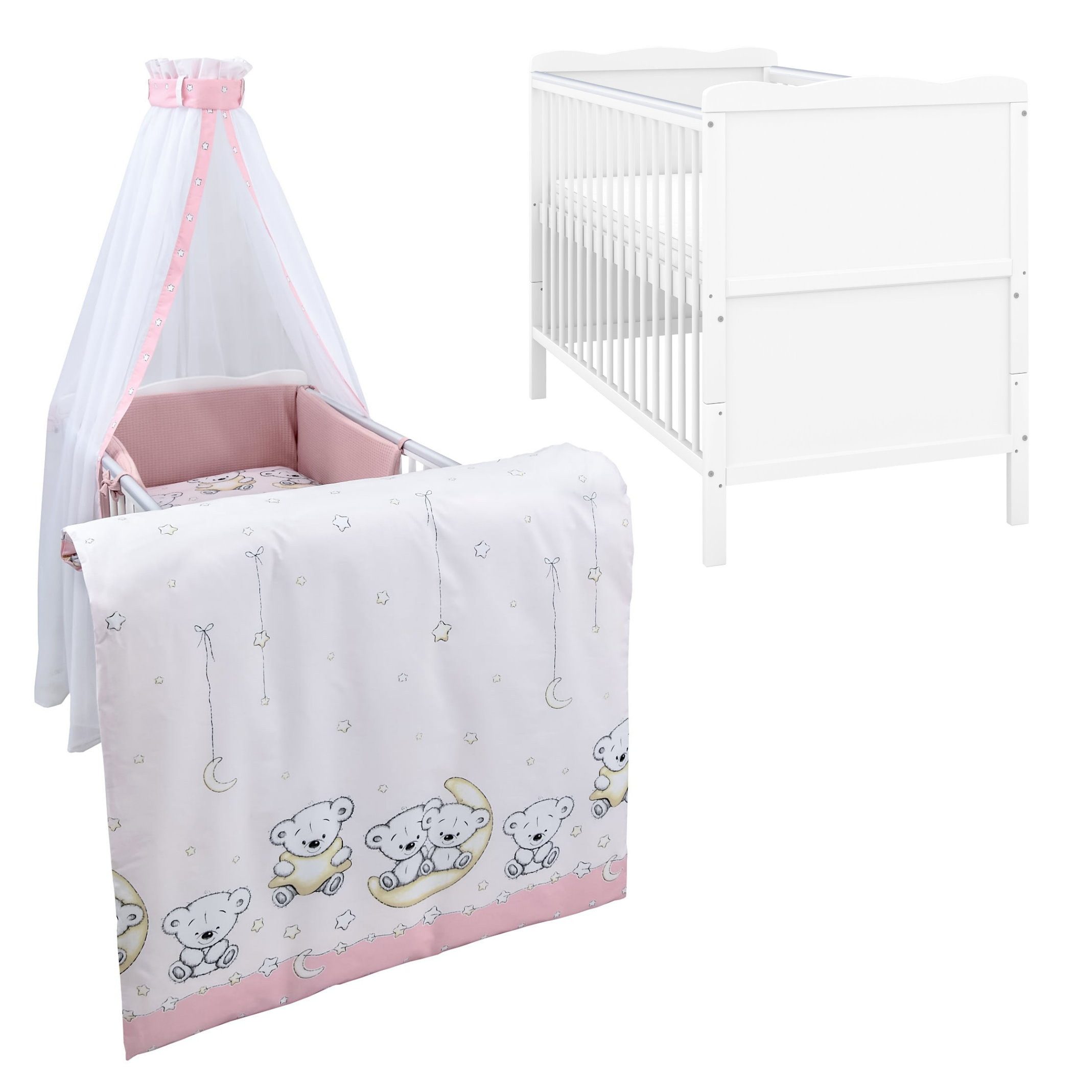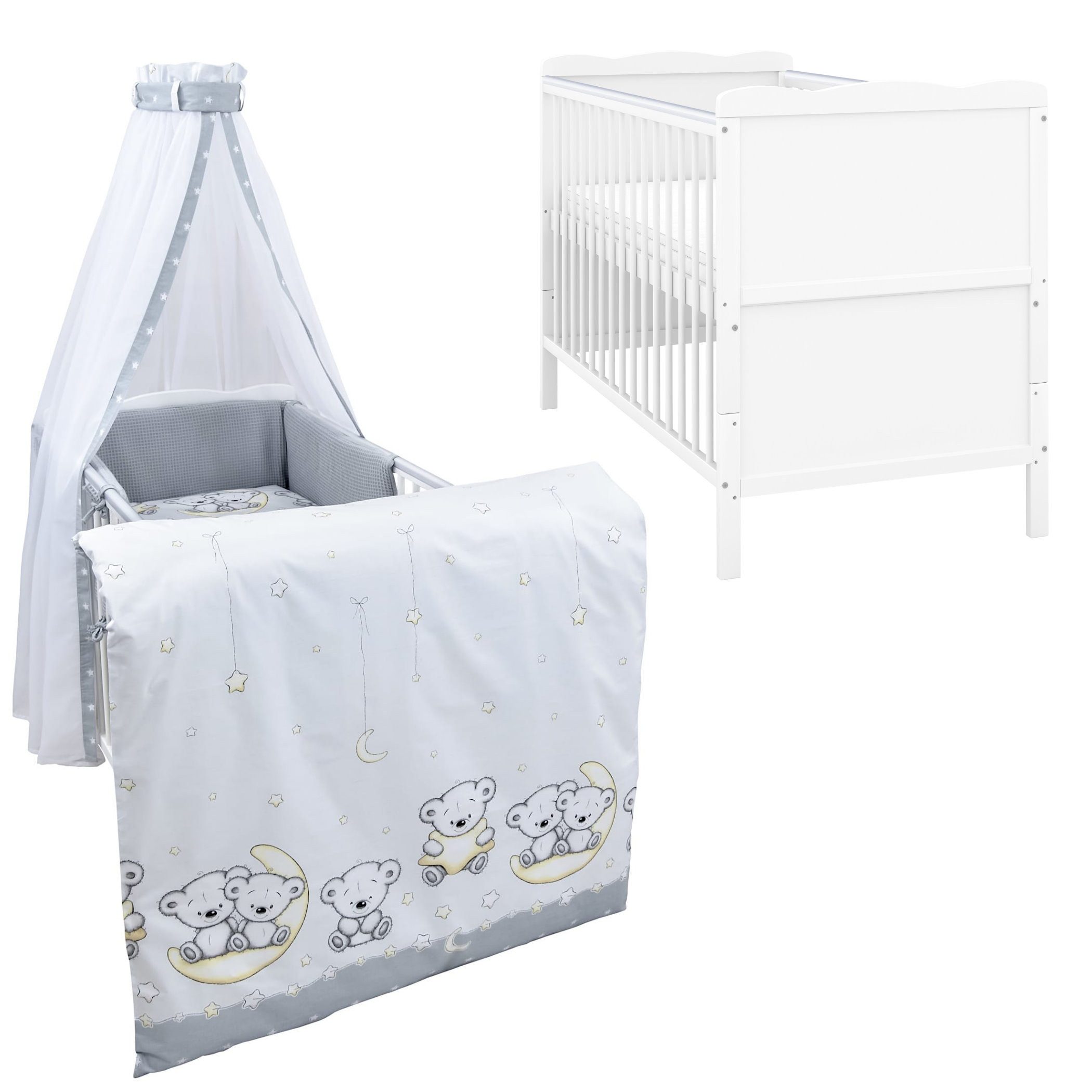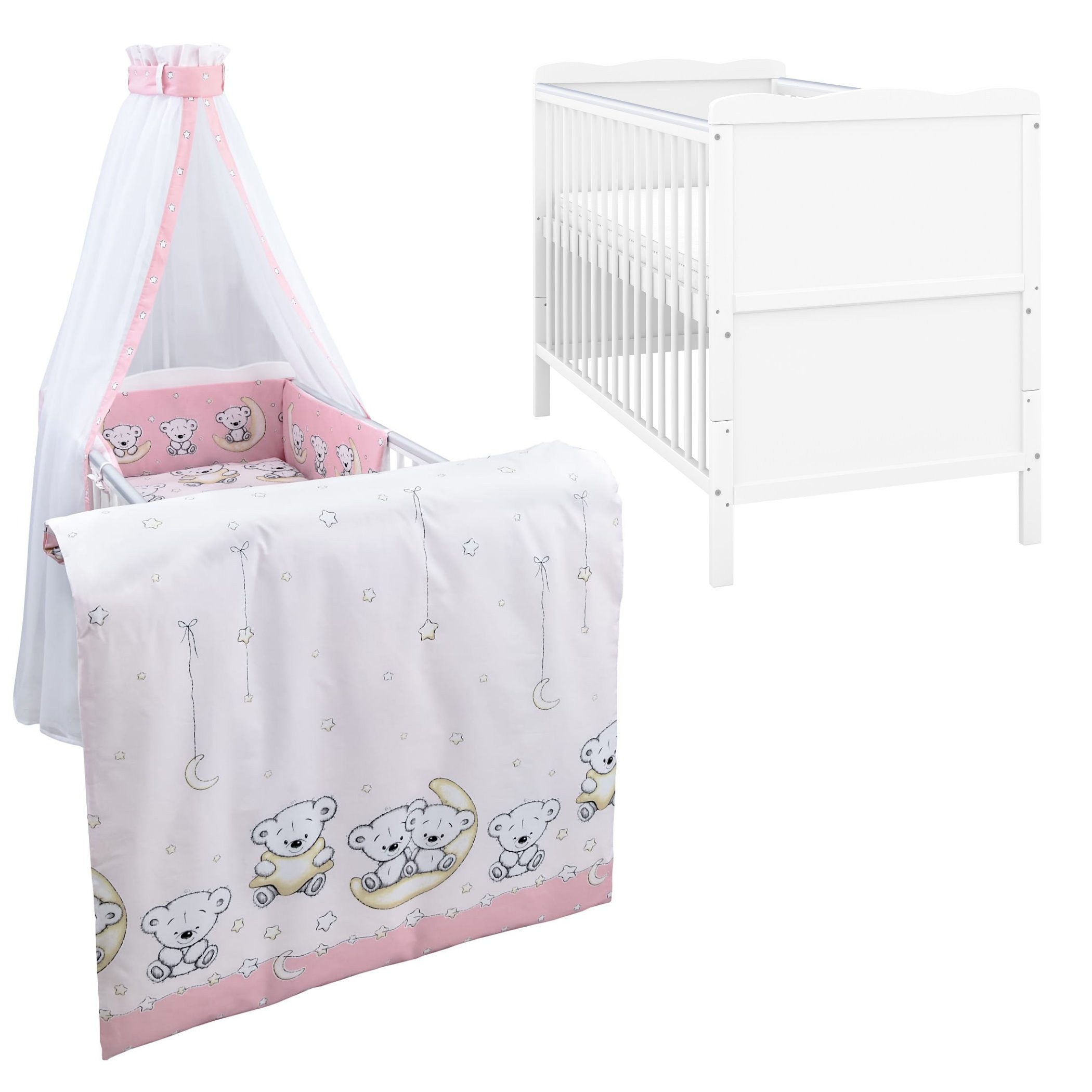 Das umfassende Set enthält eine bequeme Matratze, ein kuscheliges Nestchen, einen zauberhaften Chiffonhimmel sowie Kissen und Decke. Das Nestchen dient als Schutz und Polster, damit sich Ihr Baby nicht stößt, und ist wahlweise aus weicher Baumwolle oder aus hochwertigem Waffelpique gefertigt. Der Waffelpique überzeugt durch seine besondere Struktur, die nicht nur optisch ansprechend ist, sondern auch atmungsaktiv wirkt, angenehm weich auf der Haut liegt und zudem sehr pflegeleicht ist – ideal für die empfindliche Babyhaut. Der Chiffonhimmel schafft eine ruhige Schlafumgebung. Zudem können Sie aus verschiedenen Bettwäsche-Sets wählen, um das Bett individuell zu gestalten.