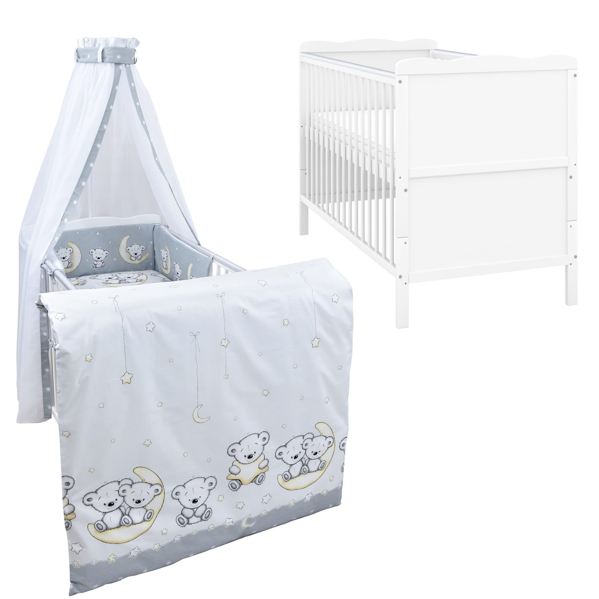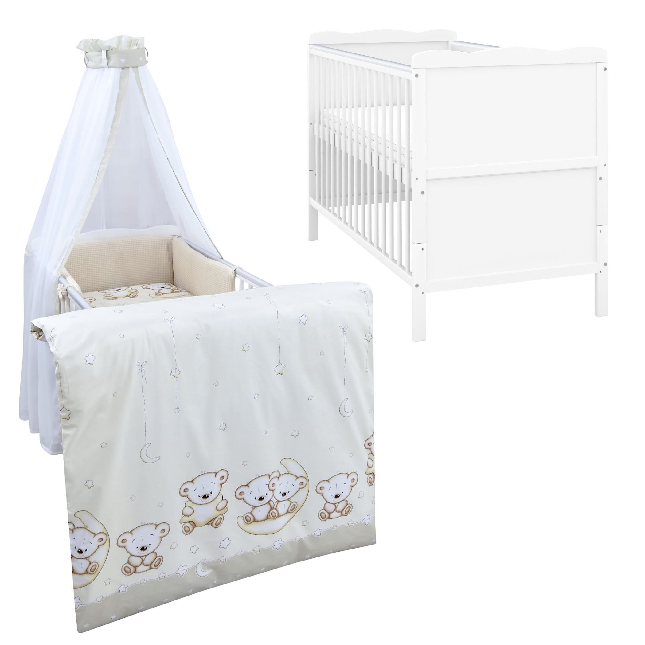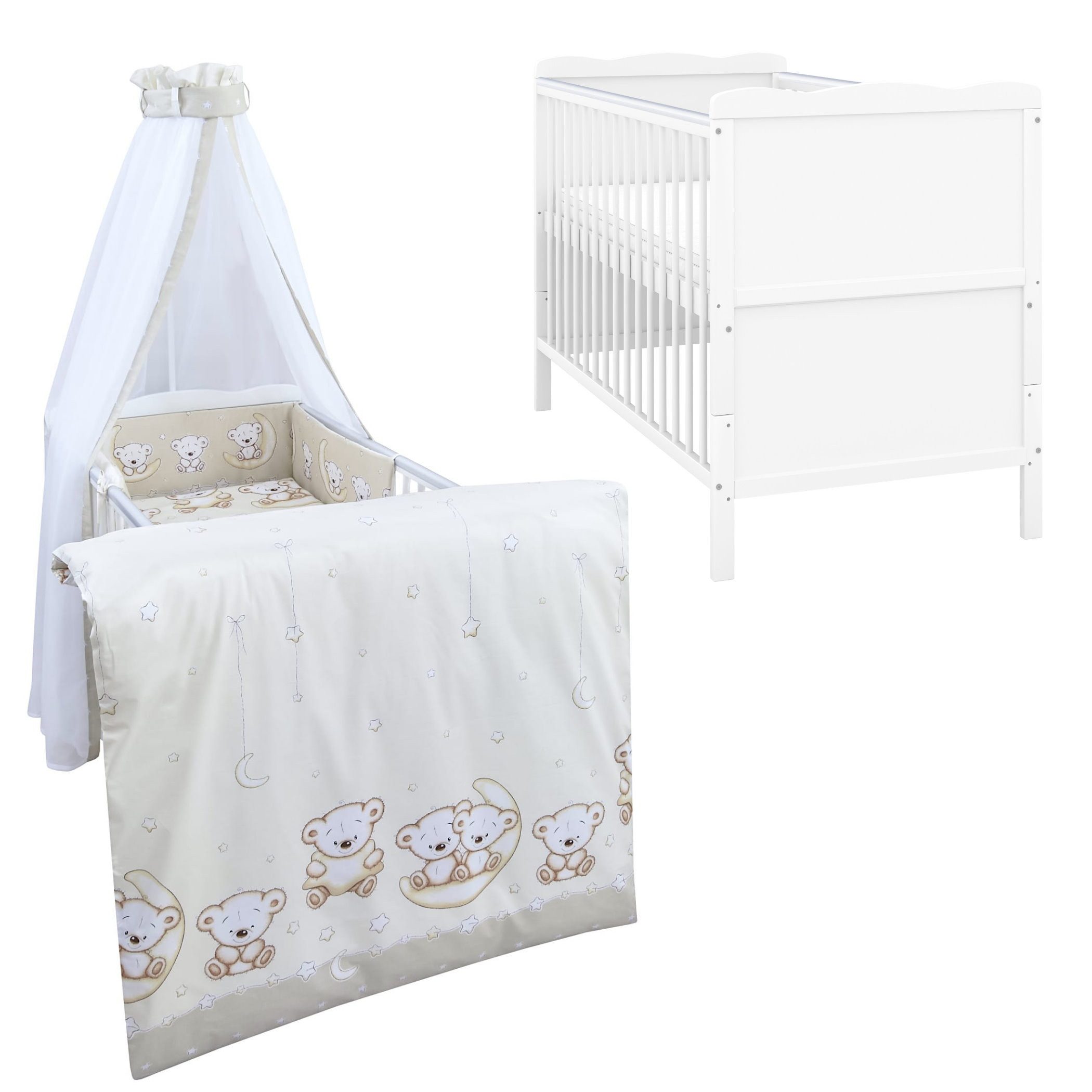 Das umfassende Set enthält eine bequeme Matratze, ein kuscheliges Nestchen, einen zauberhaften Chiffonhimmel sowie Kissen und Decke. Das Nestchen dient als Schutz und Polster, damit sich Ihr Baby nicht stößt, und ist wahlweise aus weicher Baumwolle oder aus hochwertigem Waffelpique gefertigt. Der Waffelpique überzeugt durch seine besondere Struktur, die nicht nur optisch ansprechend ist, sondern auch atmungsaktiv wirkt, angenehm weich auf der Haut liegt und zudem sehr pflegeleicht ist – ideal für die empfindliche Babyhaut. Der Chiffonhimmel schafft eine ruhige Schlafumgebung. Zudem können Sie aus verschiedenen Bettwäsche-Sets wählen, um das Bett individuell zu gestalten.