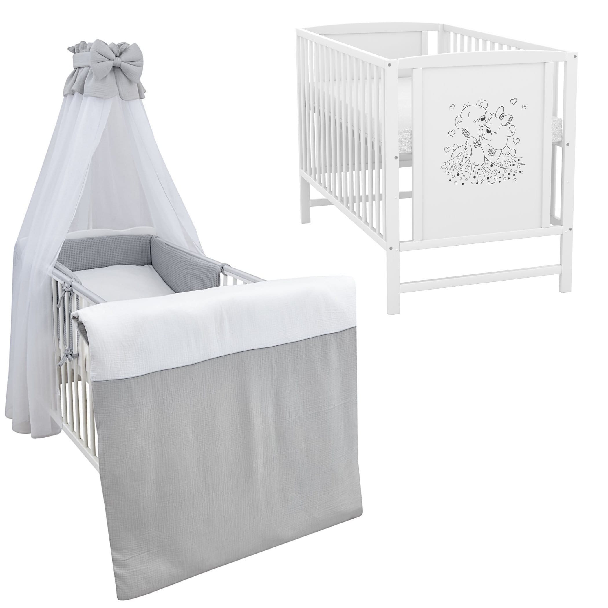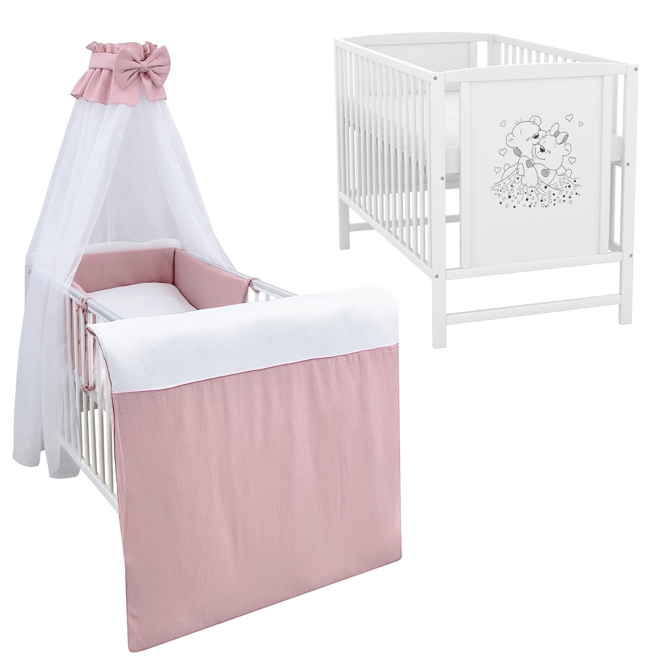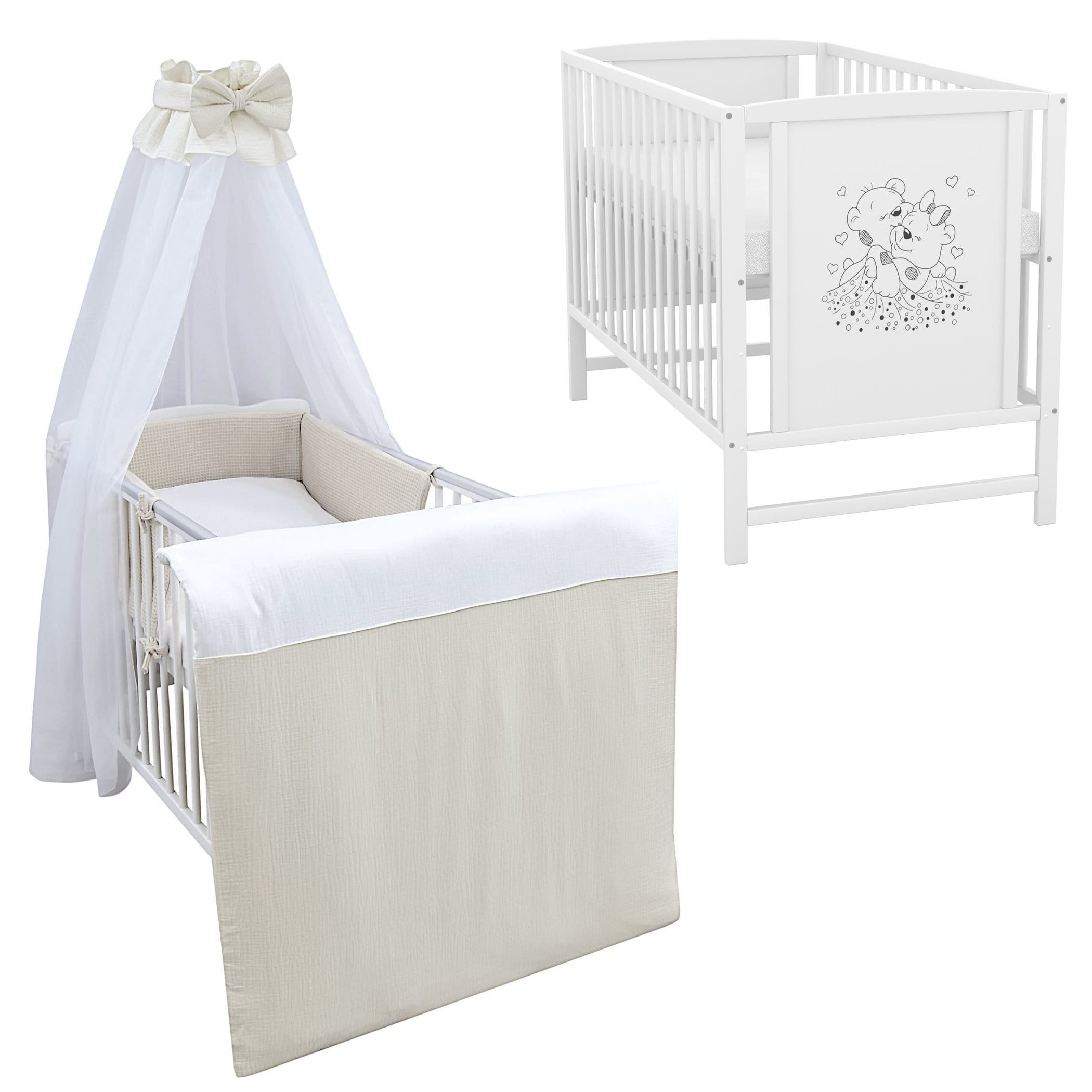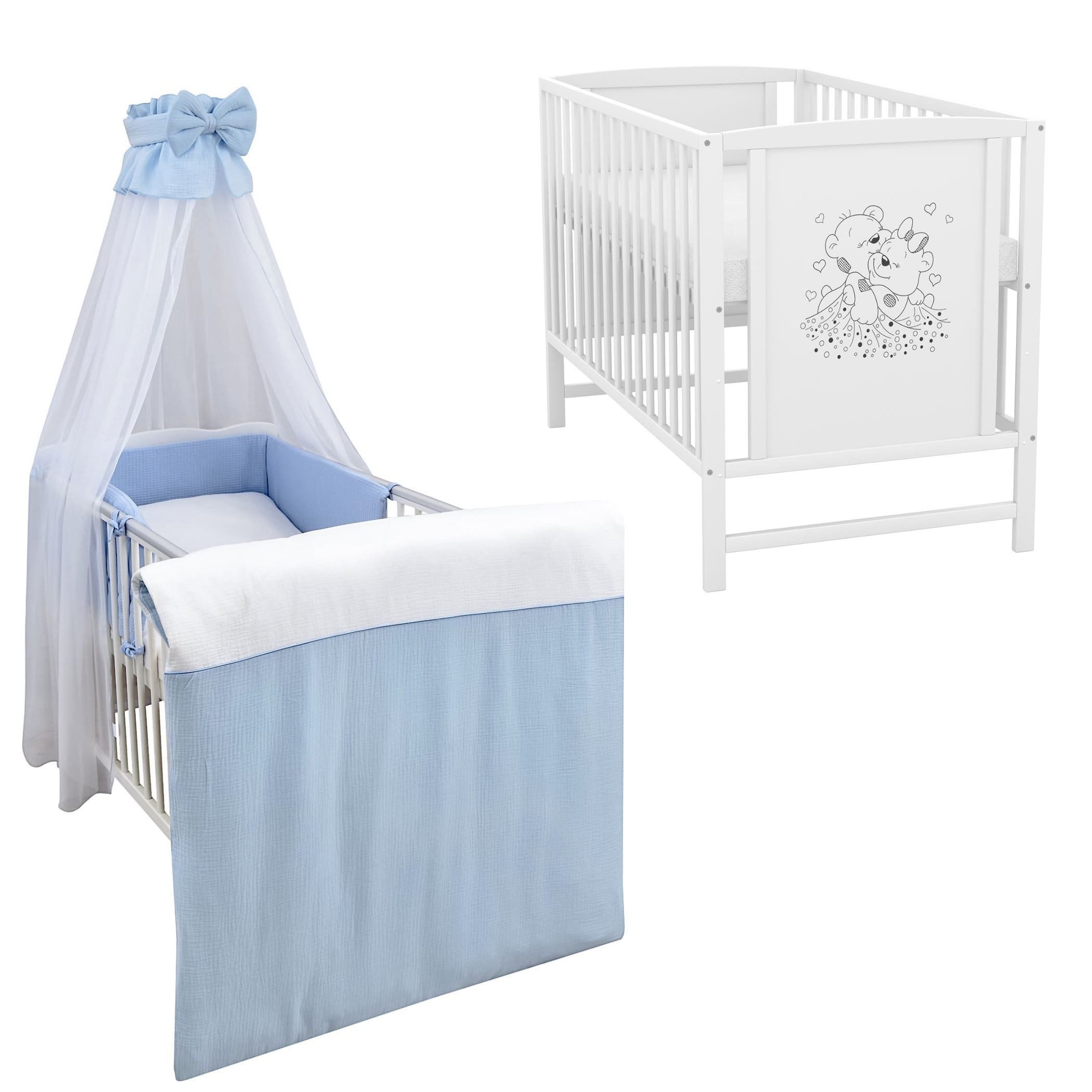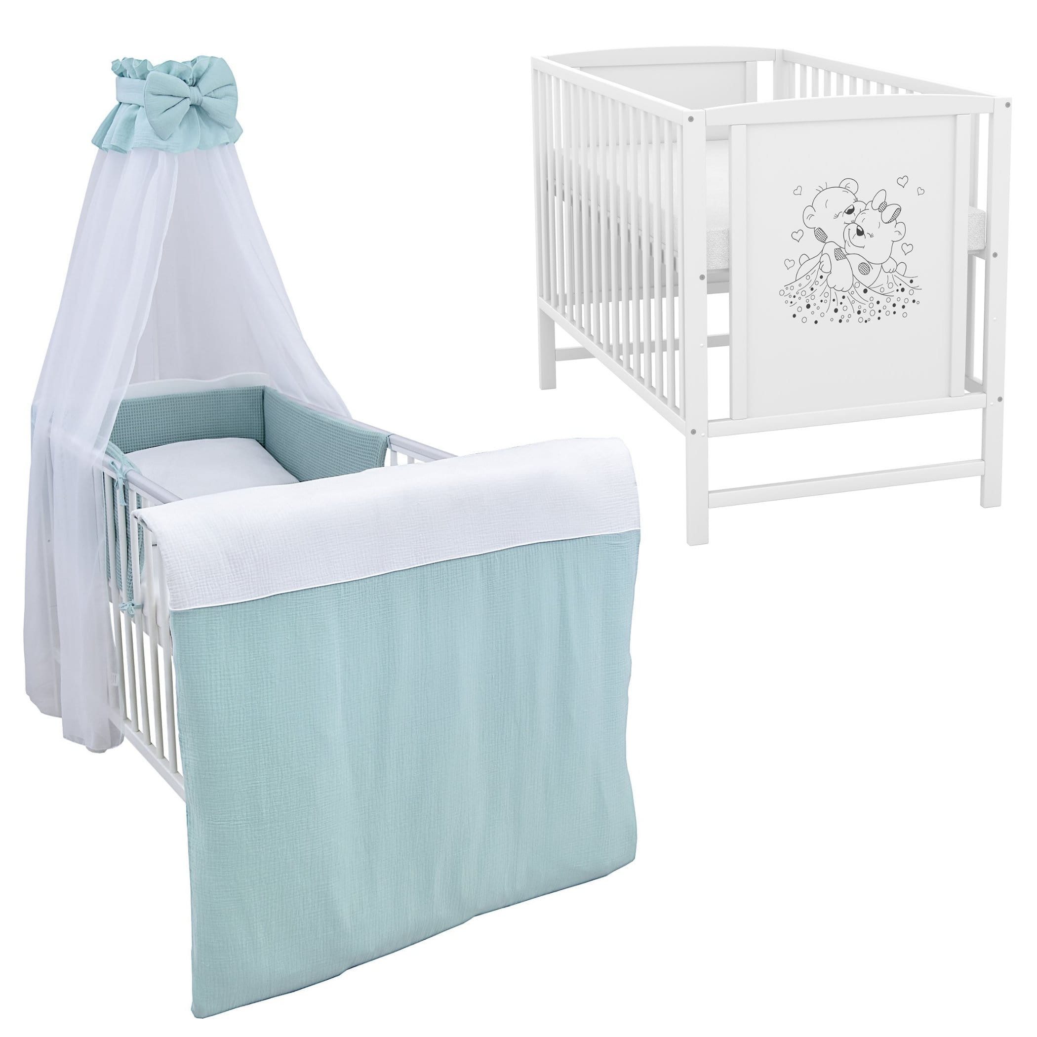 Unser Babybett Komplettset umfasst alles, was Ihr kleiner Liebling für süße Träume benötigt. Neben dem weiß lackierten Bett gehören eine Schaumstoffmatratze ca. 120x60x6 cm mit abnehmbarem Bezug (waschbar bei 40°C), ein zarter Chiffonhimmel, ein kuscheliges Nestchen aus hochwertigem Waffelpique in Mint, ein hypoallergisches Kissen und eine Decke zum Lieferumfang. Die Bettwäsche ist aus weichem Musselin gefertigt und in einem schlichten Blau gehalten – passend zum Nestchen.