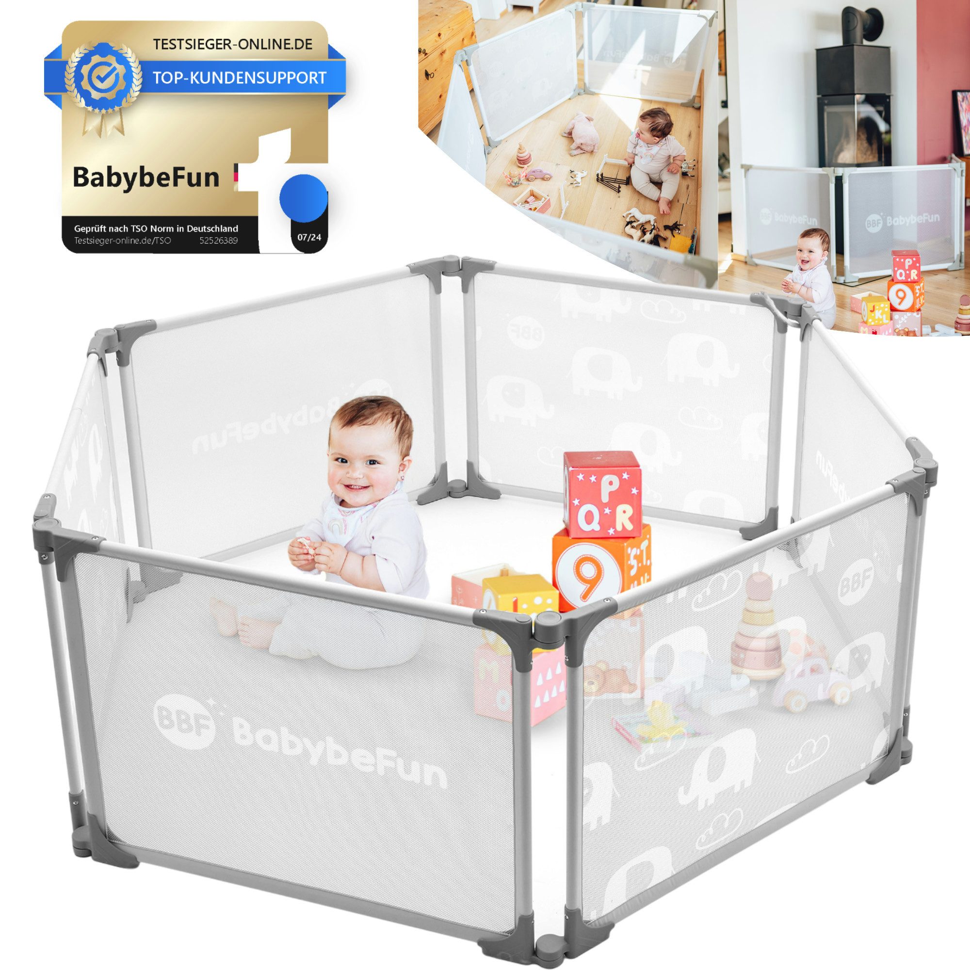 Mit Anti-Rutsch-Füßen und einem sicheren Öffnungsmechanismus kannst du sorgenfrei kochen, putzen oder entspannen, während dein Baby im Laufstall spielt.