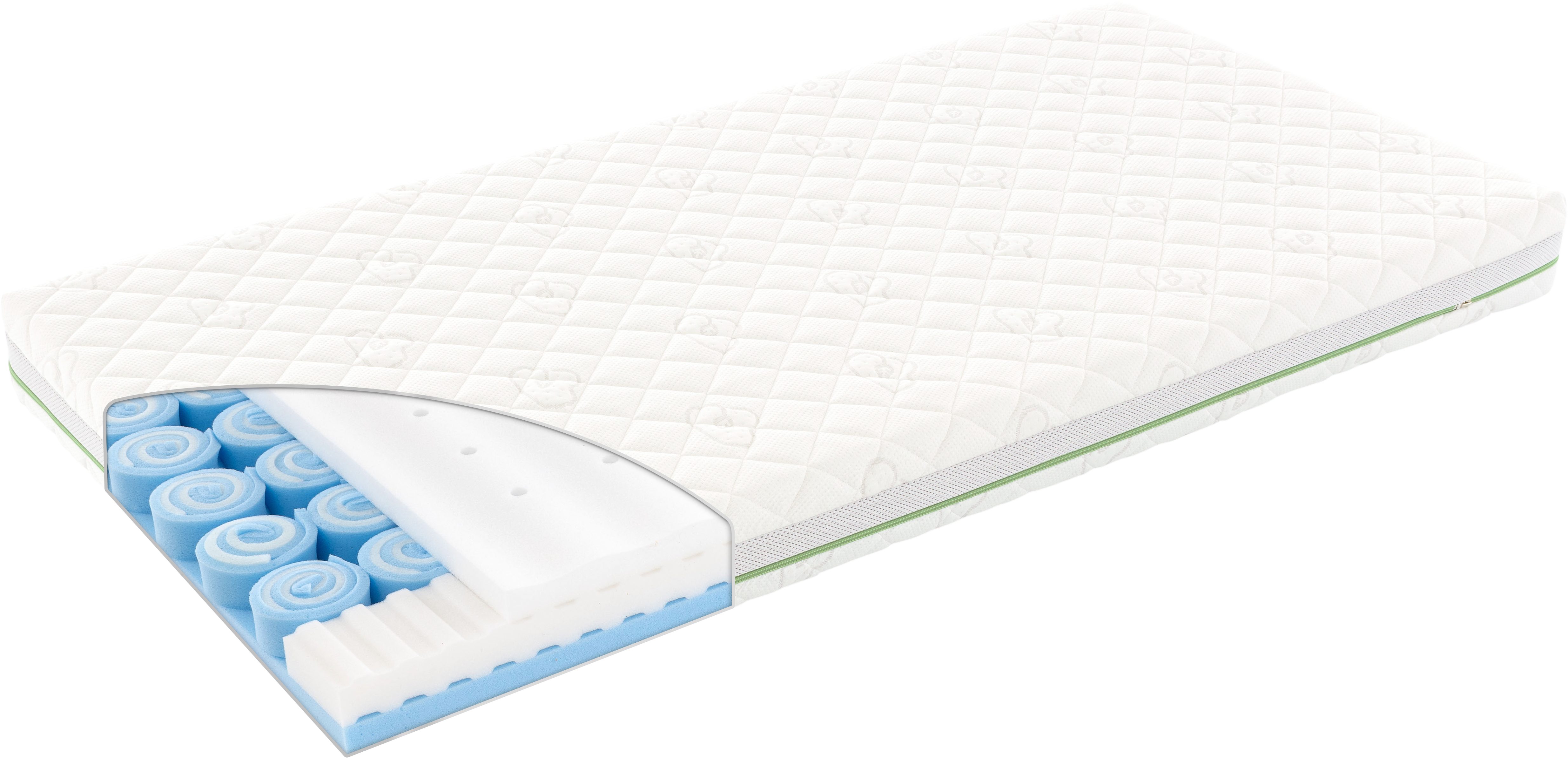 Kernaufbau | 3 cm Kaltschaum oben, 4 cm Kaltschaum Twists, 2,5 cm Kaltschaum unten (Babyseiten mit Wellenkontur, Gesamthöhe 9,5 cm, 35 kg/m3) |