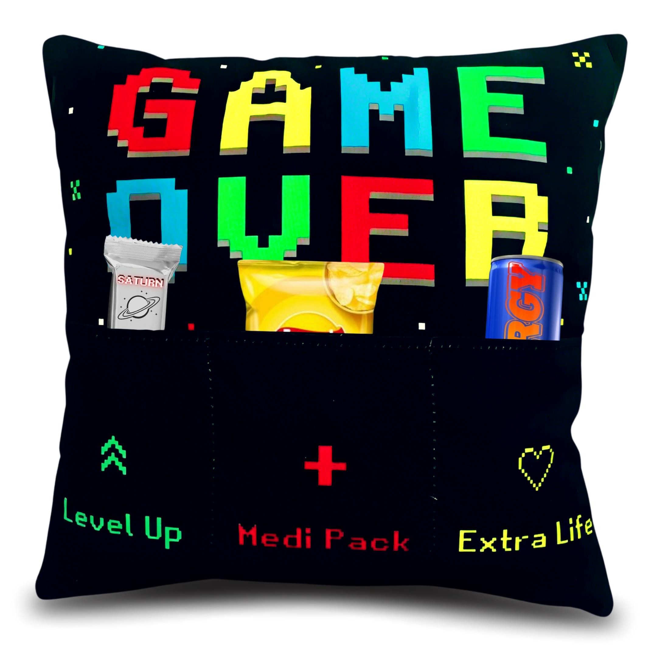 - Geburtstag vergessen? Keine Panik, wir haben die Lösung! Egal, ob für deinen Bruder, einen Kumpel, einen Freund oder einen anderen Gamer in deinem Leben – dieses Gamerkissen ist das ultimative Geschenk für jede Gelegenheit und ein Star in jedem Kinder- oder Jugendzimmer. Ü - Mit diesem mega coolen Kissen mit Taschen verwandelst du im Nu jedes Geschenk in ein personalisiertes Highlight. Perfekt, um Gutscheine, Snaks, Schüßigkeiten oder den Lieblingsdrink in Szene zu setzen, zu verschenken und dabei zu zeigen, dass du ihre Gaming-Leidenschaft voll und ganz feierst! - Ausgestattet mit drei praktischen Taschen zum Befüllen 13x7 cm, bietet dieses Kissen nicht nur Komfort, sondern auch Funktionalität. Ideal, um kleine Gaming-Zubehörteile, die Fernbedienung, Snacks oder persönliche Gegenstände ordentlich zu verstauen und immer in Reichweite zu haben. - Das Couchkissen mit dem Schriftzug "Game Over" mit Kisseninlay hat die Maße von 40x40 cm und der Bezug ist abnehmbar. Es schafft eine gemütliche Atmosphäre, mach aus jedem Raum eine Gaming-Oase und lädt zu entspannten Gaming-Abenteuern ein.