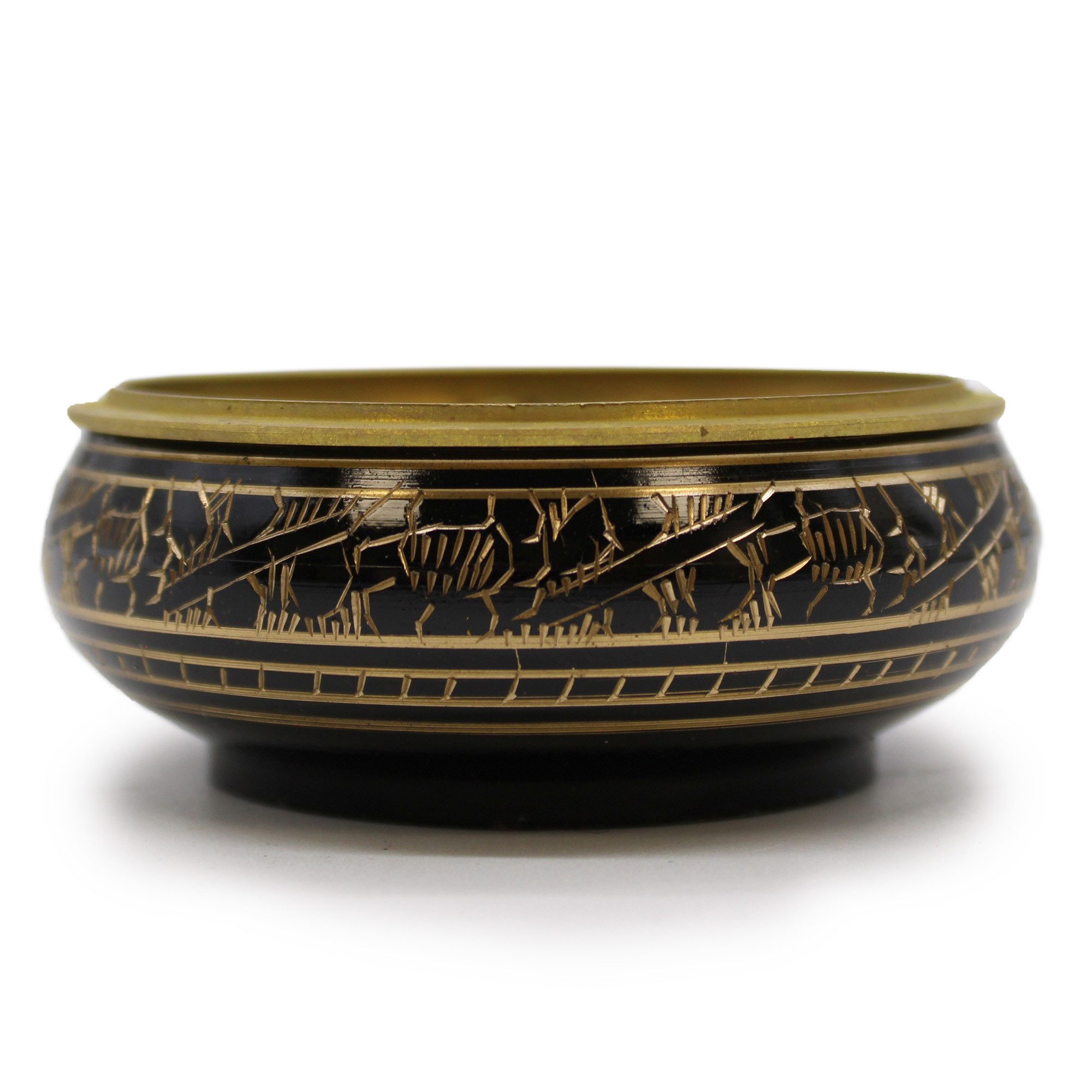 Dieses traditionell handgeschnitzte Weihrauch-Räuchergefäß aus Messing mit Untersetzer wird direkt von einem Familienbetrieb aus der alten Messingstadt Morodabad importiert. Schwarz. Bitte unbedingt beachten: das Gefäß kann bei Gebrauch sehr heiß werden. Stellen Sie es auf eine flache, stabile und hitzebeständige Oberfläche und halten Sie es von brennbaren Gegenständen fern. Maße: 7,7x3cm, 95g. Material: 100% Messing
