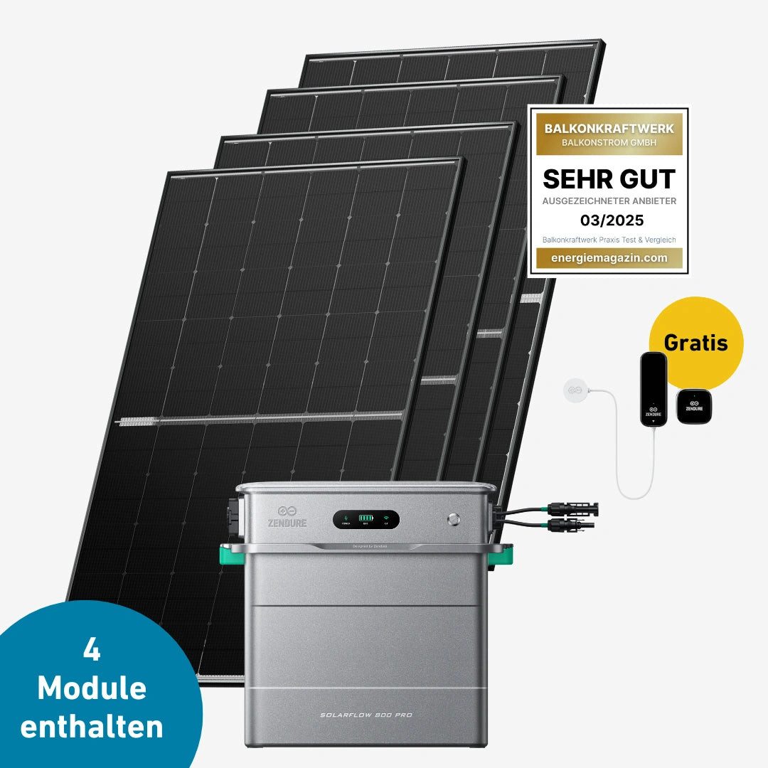 Balkonkraftwerk mit vier bifazialen Solarmodulen (1800 W) und Zendure Solarflow 800 Pro Stromspeicher. 1,92 kWh Speicherkapazität und 800 Watt bidirektionalem Mikrowechselrichter. Gratis dazu: Zendure Smart Meter für intelligente Energiesteuerung per App.