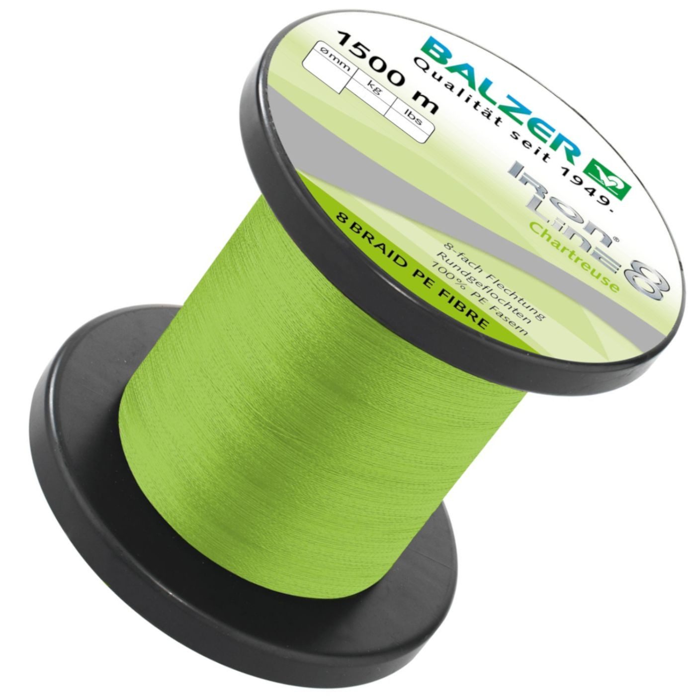 Balzer Chartreuse Iron Line - geflochtene Angelschnur - Die Hauptschnur von Balzer ist eine tolle Spinnschnur zum Kunstköderangeln mit Softbaits und Hardbaits, die aufgrund ihrer Färbung in Chartreuse eine sehr gute Sichtbarkeit bei verschiedenen Lichtverhältnissen bietet. Die Geflechtschnur ist 8-fach rundgeflochten und sie besitzt eine weiche, aber dennoch abriebfeste Oberfläche, wodurch sie nahezu lautlos durch die Ringe gleitet.