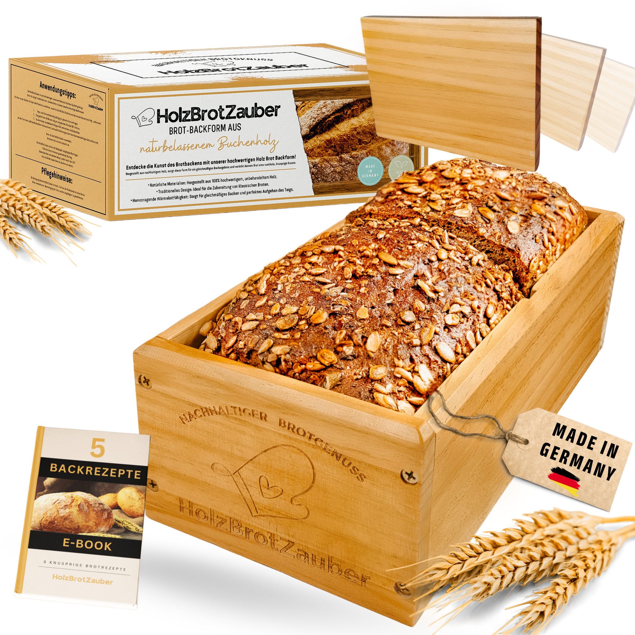 HOLZBROTZAUBER 30cm Brotbackform aus Buchenholz , integrierter Trennsteg, Brotbackrahmen für 1,5kg Brot, E-Book mit Brotrezepten