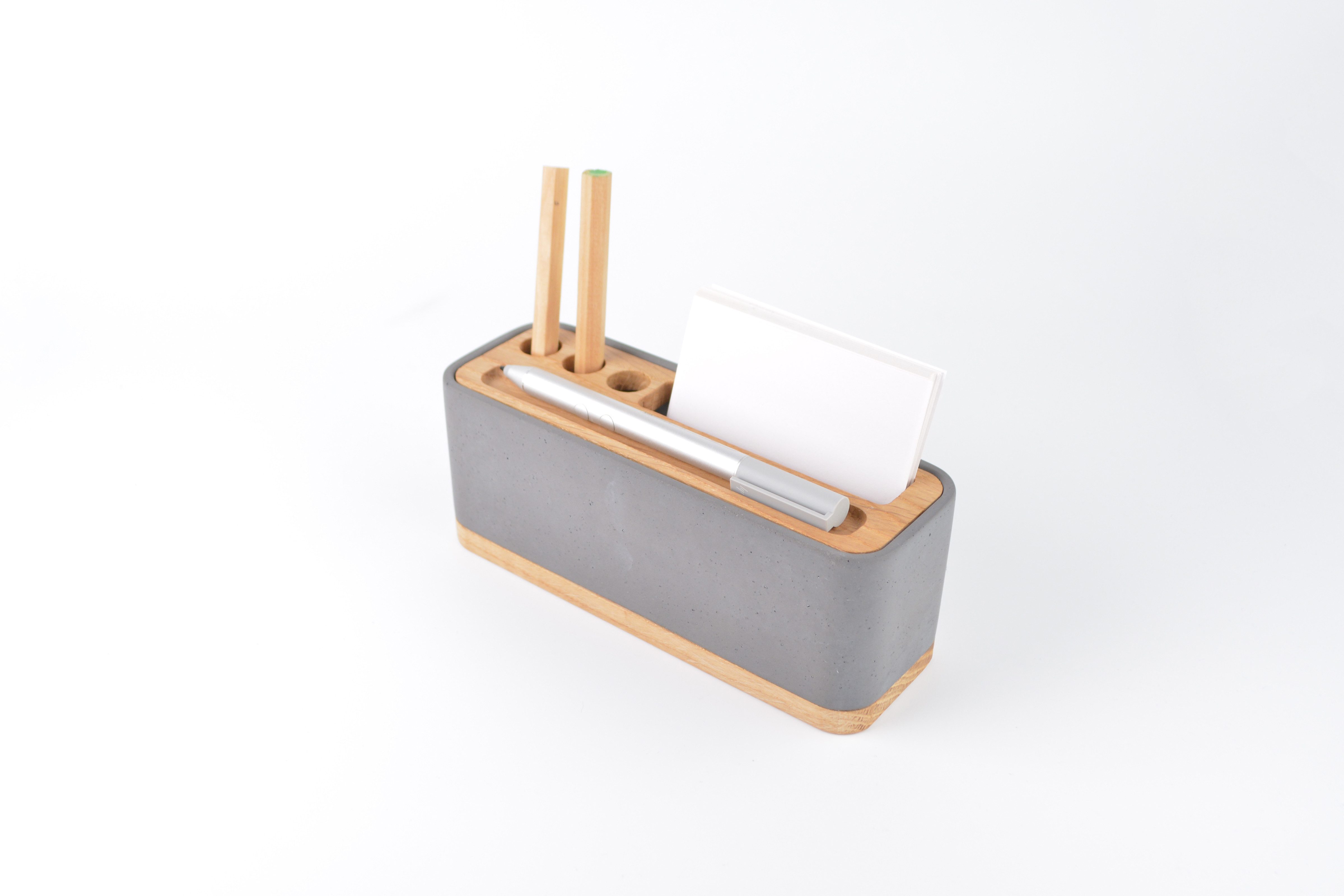Dieser Schreibtisch-Organizer ist ein moderner Stifthalter aus Beton und Holz. Der handgefertigte BANNIK Organizer aus Beton & Holz ist die perfekte Lösung für alle, die Design & Funktion auf dem Schreibtisch vereinen möchten. Mit einer Kombination aus durchgefärbtem Beton & massiver Eiche fügt sich der Organizer stilvoll in moderne Büro- & Wohnwelten ein.