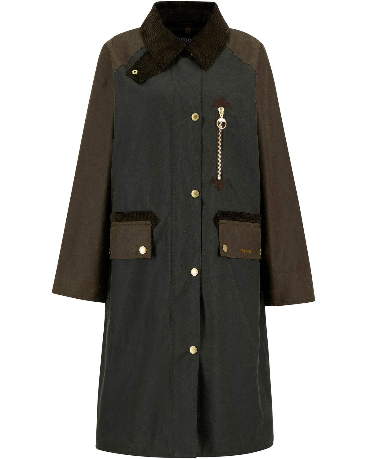 Klassischer Wachsmantel im modernen Design Der Damen Wachsmantel Evette von Barbour ist aus 6oz Sylkoil gewachster Baumwolle gefertigt und bietet sowohl Stil als auch Funktionalität. Inspiriert von traditionellen Modellen, kombiniert dieser Wachsmantel klassische Elemente mit modernen Details. Der Cordkragen und die Druckknopfleiste mit darunterliegendem Reißverschluss sorgen für einen eleganten Look, während eine tiefe Rückenfalte Bewegungsfreiheit und Komfort bietet. Praktische Merkmale für den Alltag Ein besonderes Highlight ist die vertikale Reißverschlusstasche auf der linken Brust, die sich ideal für die Aufbewahrung von Karten oder kleinen Gegenständen eignet. Zusätzlich bietet der Mantel zwei Frontpattentaschen für weiteren Stauraum. Das Tartan-Innenfutter im Mantel und an der Innenseite der Armabschlüsse verleihen einen klassischen britischen Charme. Mit einer Rückenlänge von 104 cm und einem Relaxed Fit, der es ermöglicht, Kleidung bequem darunter zu tragen, ist der Wachsmantel Evette perfekt für kühle Tage und vielseitige Anlässe. Pflegeleicht, kann er einfach mit einem Schwamm gereinigt werden. Bei Bedarf kann der Mantel mit dem Thornproof Dressing eigenständig nachgewachst werden. Oberstoff: 100% Baumwolle; Futter: 65% Polyester, 35% Baumwolle