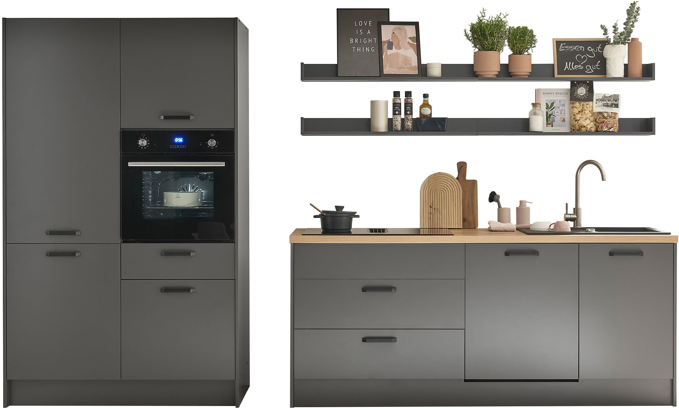 Ausstattung | Durchgehende Arbeitsplatte Schubkästen und Türen mit Soft-Close-Funktion Seitenverkehrt stellbar mit E-Geräten |