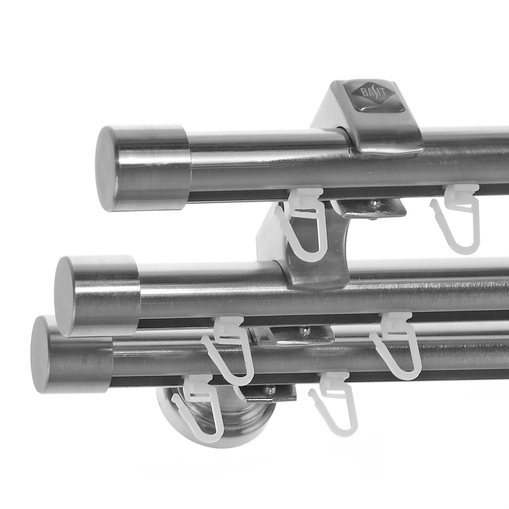Lieferumfang | Gardinenstangen bis 2 m: 3 Stangen, 2 Träger, 2 Endstücke (wählbar) vorne und 4 Endstücke (E30) hinten.Gardinenstangen über 2 bis 4 m: 6 Stangen, 3 Rohrverbinder, 3 Träger, 2 Endstücke (wählbar) vorne und 4 Endstücke (E30) hinten.Gardinenstangen über 4 bis 6 m: 9 Stangen, 6 Rohrverbinder, 4 Träger, 2 Endstücke (wählbar) vorne und 4 Endstücke (E30) hinten.Es ist für alle 10 cm je ein X-Gleiter mit Faltenhaken im Lieferumfang enthalten. |