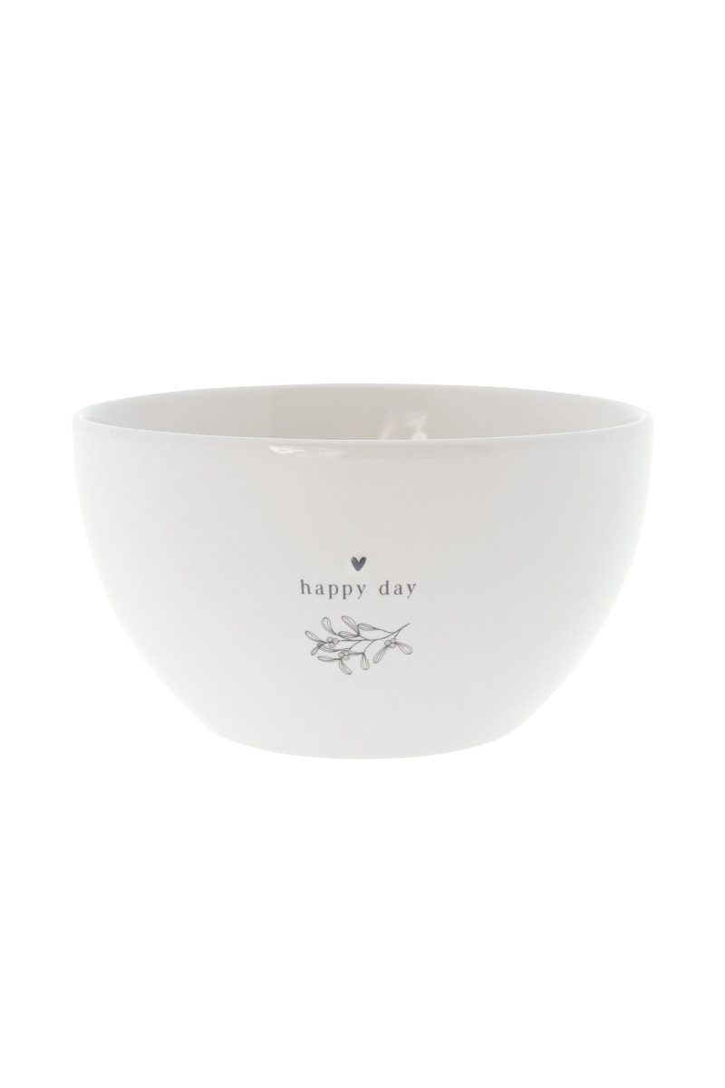 Ob für Desserts, Müsli, Cornflakes, Eiscreme, Salate usw. - mit dieser Schale im Scandi-Look sorgen Sie für einen geschmackvollen Eyecatcher auf Ihrem Tisch. Die Schale hat eine Füllmenge von ca. 300 ml und ist mit einem kleinen Herz-Motiv, dem Schriftzug "happy day" sowie einem zarten, beblätterten Zweig teils handbemalt.