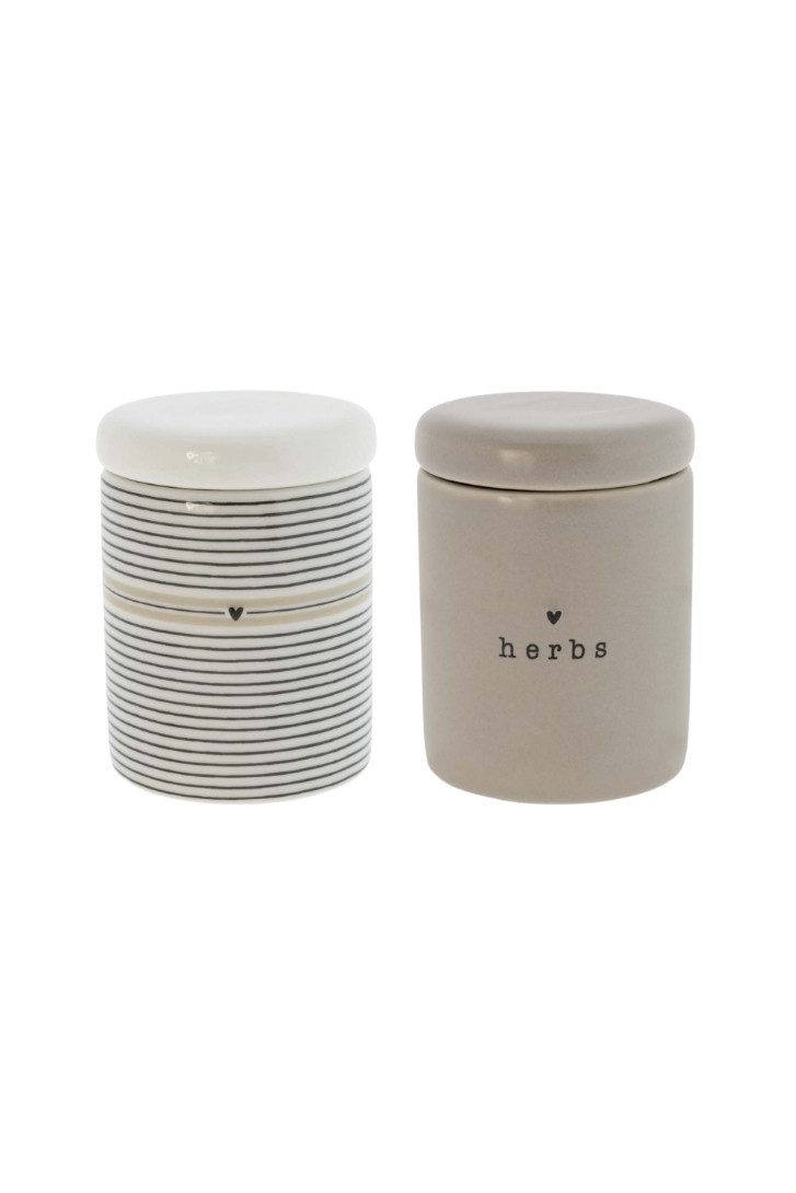 Diese niedlichen, zylinderförmigen Vorratsdosen aus Keramik im Scandi-Look als 2er Set sind in zwei Designs gestaltet, werden von Hand bemalt und haben jeweils einen farblich passenden, leicht gewölbten Deckel zum lose Auflegen. Die weiße Варианты (glänzend) hat ringsum ein zartes Linien-Muster in Schwarz, mittig zwei schmale Streifen in Titan und vorderseitig ein kleines, leicht erhabenes Herz in Schwarz zwischen den Streifen, die uni titan-farbene Варианты (matt) ziert vorn ein kleines, leicht erhabenes Herzchen sowie der Schriftzug "herbs" in Schwarz. Die kleinen Vorratsbehälter eignen sich super für Gewürze, getrockene Kräuter usw.