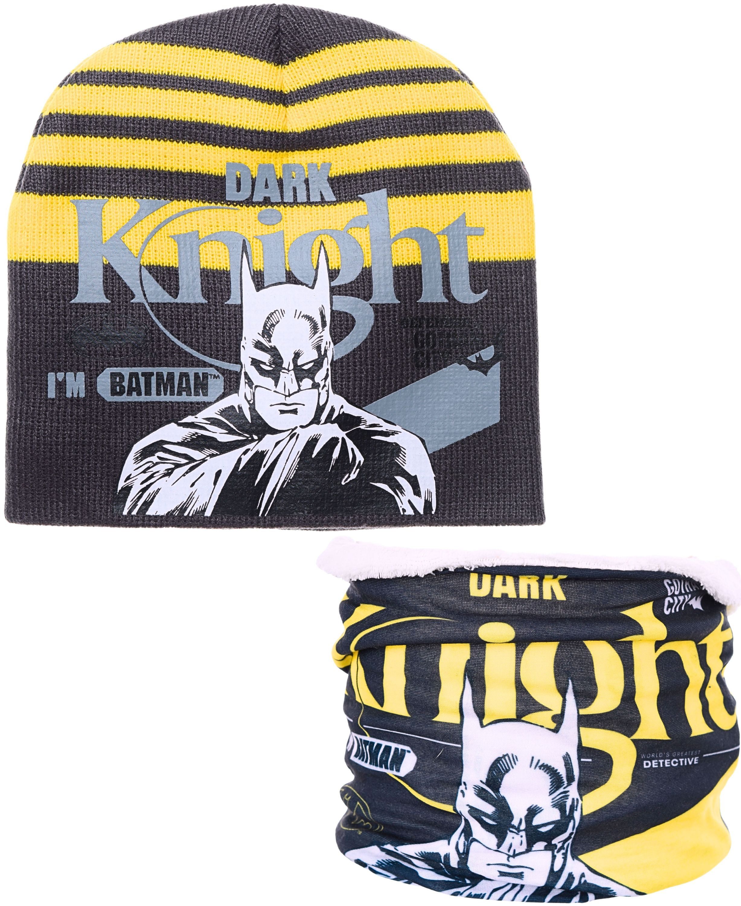 Die doppellagige Schlupfmütze mit passendem Schlauchschal schützt Kopf, Hals und Ohren zuverlässig vor Wind und Kälte. Das auffällige "Dark Knight"-Design mit kontrastierenden Streifen und einem detailreichen Batman-Print macht dieses Set zu einem echten Hingucker für kleine Superhelden.