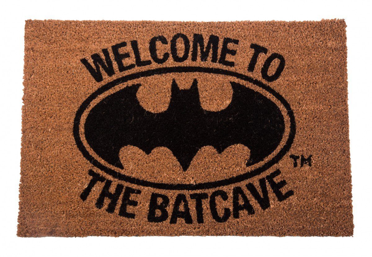 Die Fußmatte zeigt das Batsymbol und den Schriftzug "Welcome to the Batcave".