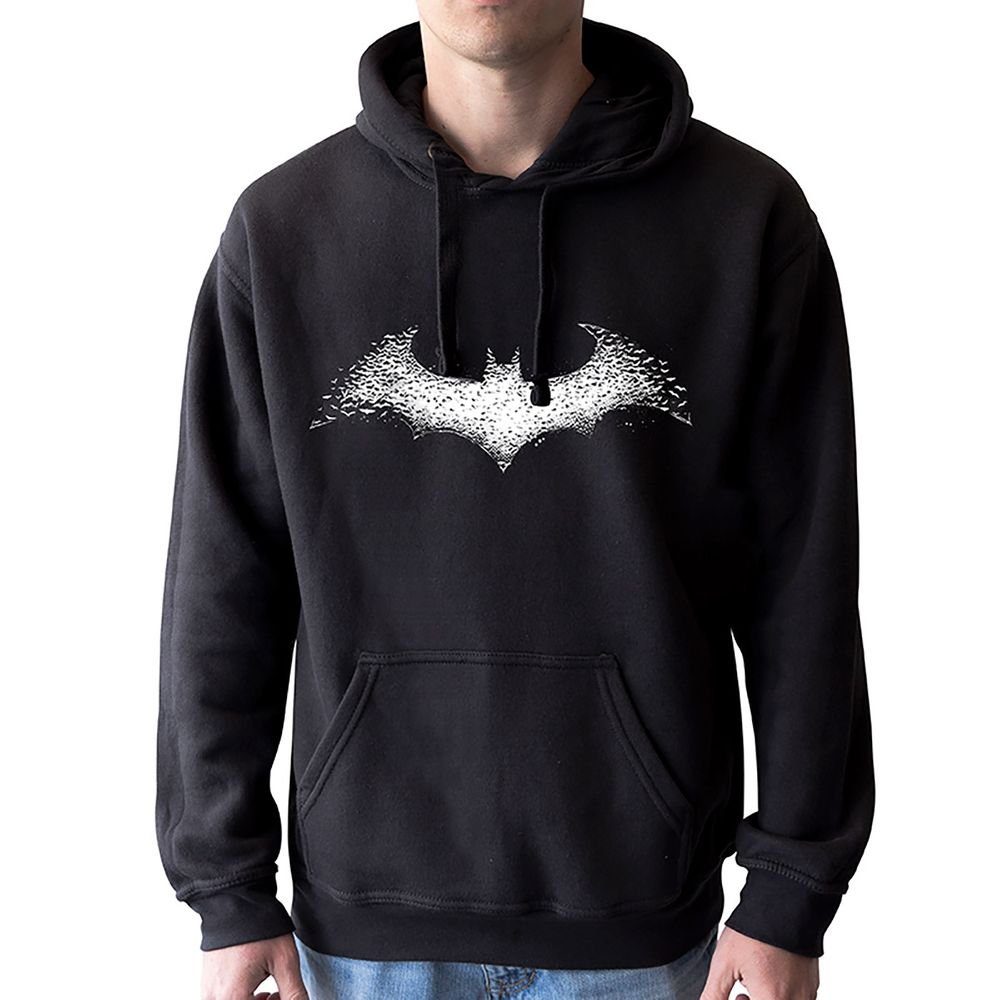 Der Hoodie zeigt das Batsymbol mit vielen Fledermäusen.