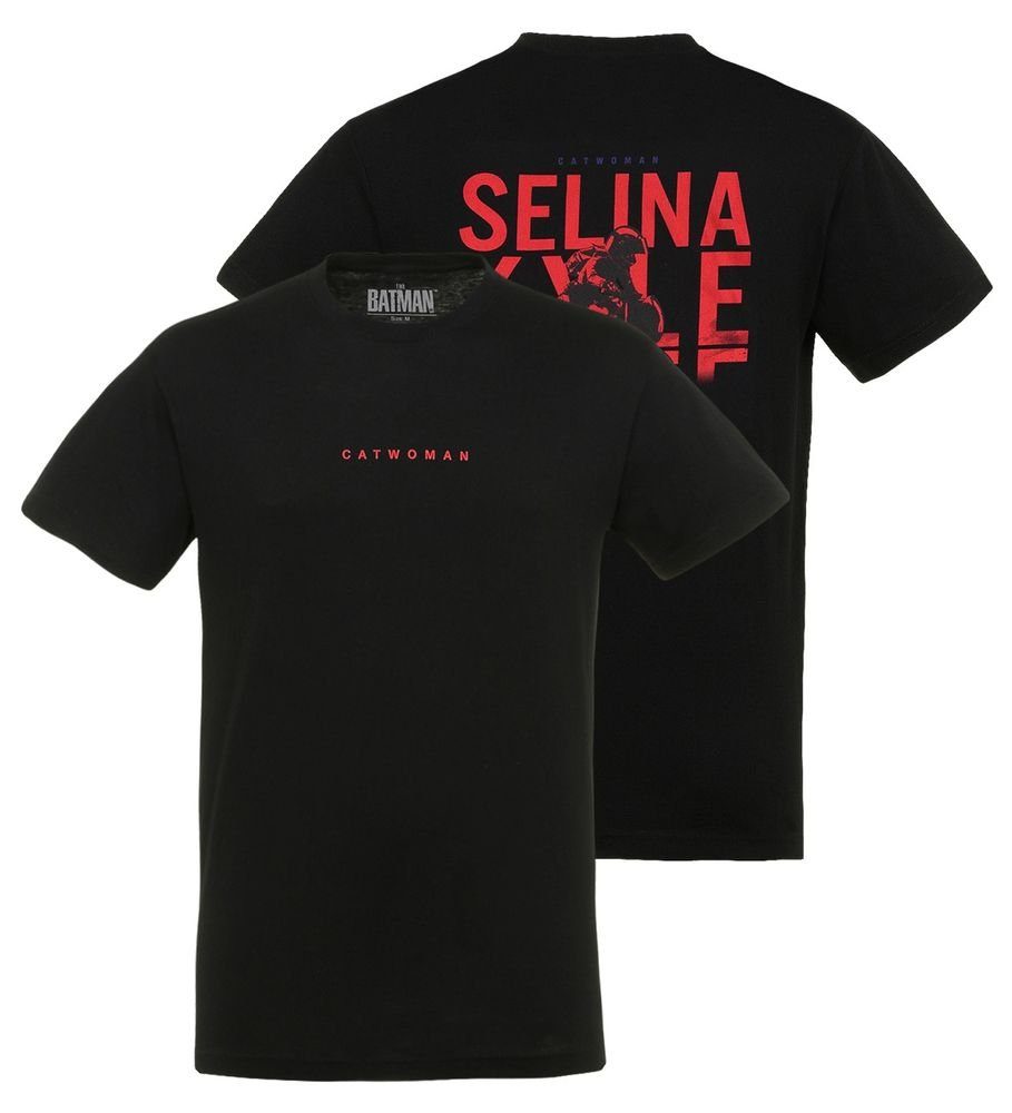 Das T-Shirt zeigt das Wort "Catwoman" und Selina auf einem Motorrad.