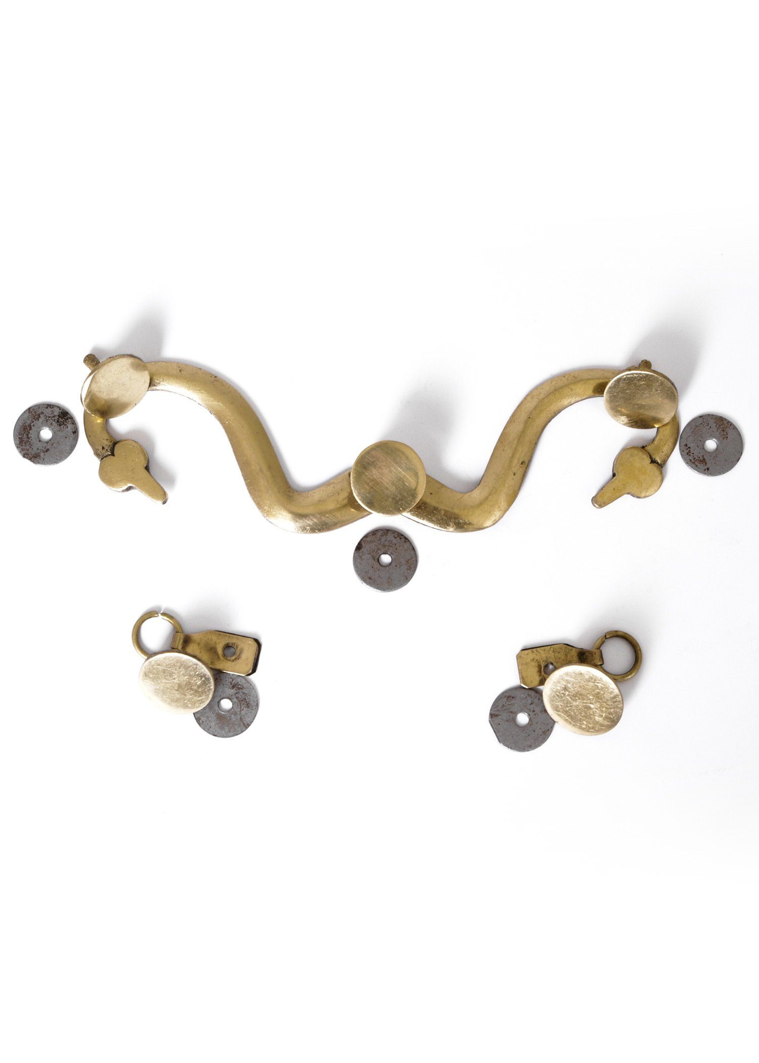 Gefertigt wurden die Haken, Ösen und Knöpfe aus Messing, die 5 Konterscheiben der Knöpfe sind aus Eisen. Dieses 14-teilige Set zur Selbstmontage ist für das römische Kettenhemd Lorica Hamata geeignet aber auch für jene, die ihr Hemd selbst herstellen oder modifizieren möchten.