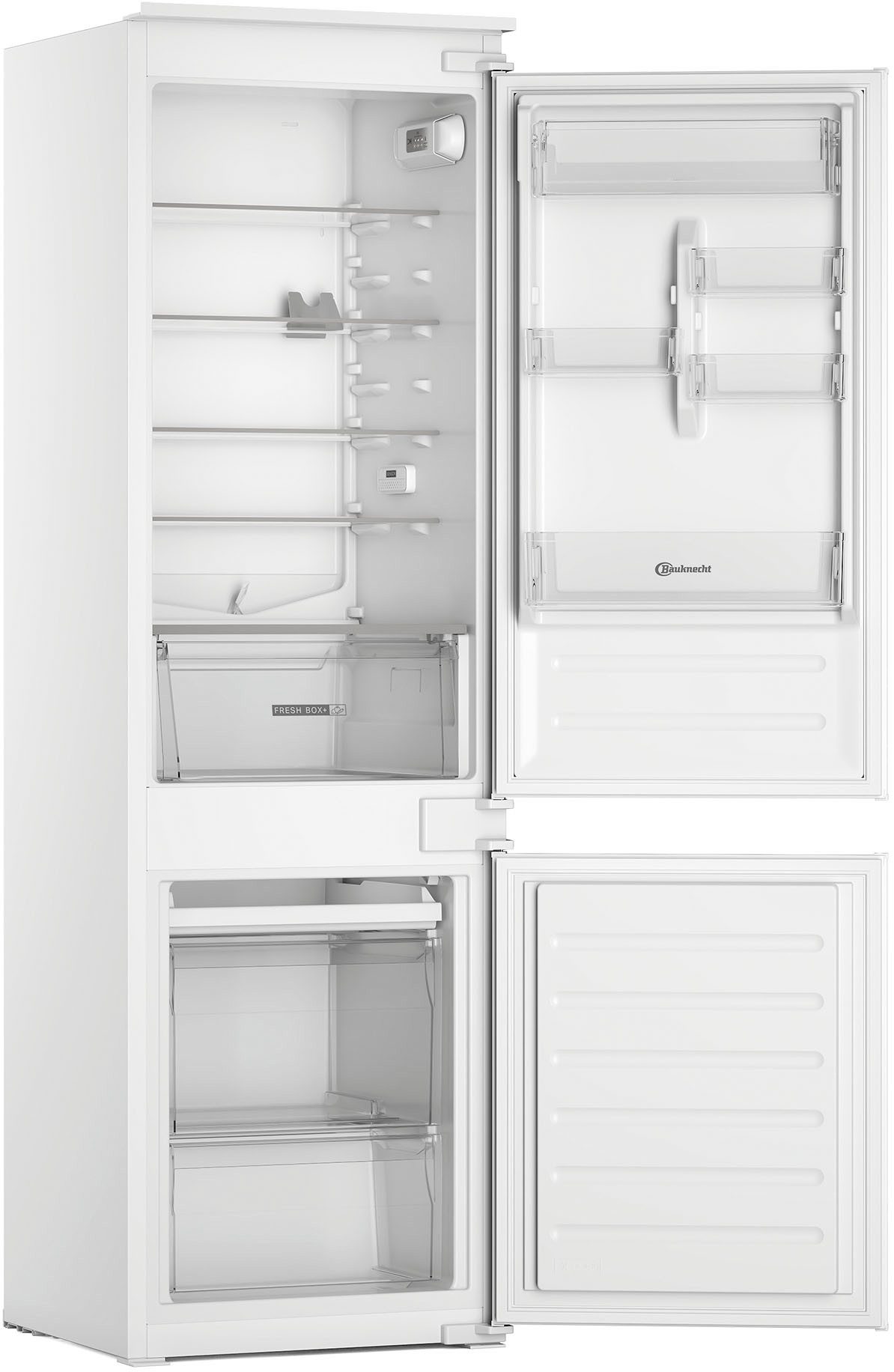 Die integrierbare Einbaukühlgefrierkombination »BKGIL 178S12« ist von der Marke BAUKNECHT. Das Gerät bietet ausreichend Platz für deinen Einkauf durch seine Maße von 55,7 x 177 x 54,5 cm (B/H/T) und das Gefriervolumen von 79 l und Kühlvolumen von 189 l. Das Betriebsgeräusch des Modells liegt bei 34 dB. Das Modell besitzt zwei Gefrierschubladen und eine Gemüseschublade. Auf fünf Ablageflächen aus Sicherheitsglas, davon vier höhenverstellbar, ist in der Einbaukühlgefrierkombination genug Raum für Lebensmittel. Für eine einfachere Befüllung ist das Gerät mit einer ausziehbaren EasyAccess-Platte ausgestattet. Zusätzliche Variabilität bei der Aufbewahrung bieten die fünf Türablagen. Steht die Tür zu lange offen, gibt die Einbaukühlgefrierkombination ein optisches Warnsignal. Den Überblick behält man außerdem durch die LED-Innenbeleuchtung. Für diejenigen, die auf der Suche nach einer Einbaukühlgefrierkombination sind, ist die »BKGIL 178S12« von BAUKNECHT eine gute Wahl.