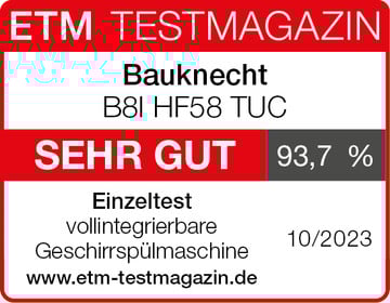 Die Bauknecht B8I HF58 TUC erzielt im Einzeltest des „ETM TESTMAGAZINS“ das Gesamtergebnis „sehr gut (93,7 %)“. Die sehr hohe Funktionalität überzeugt mit einer „sehr guten“ Reinigungs- und Trocknungsleistung sowie hervorragenden weiteren Funktionen. Das Gerät verbraucht sehr wenig Strom und wenig Wasser und arbeitet sehr leise. Außerdem ist es sehr leicht zu handhaben. Insgesamt ist die Geschirrspülmaschine „flexibel, geräumig & spülstark“.