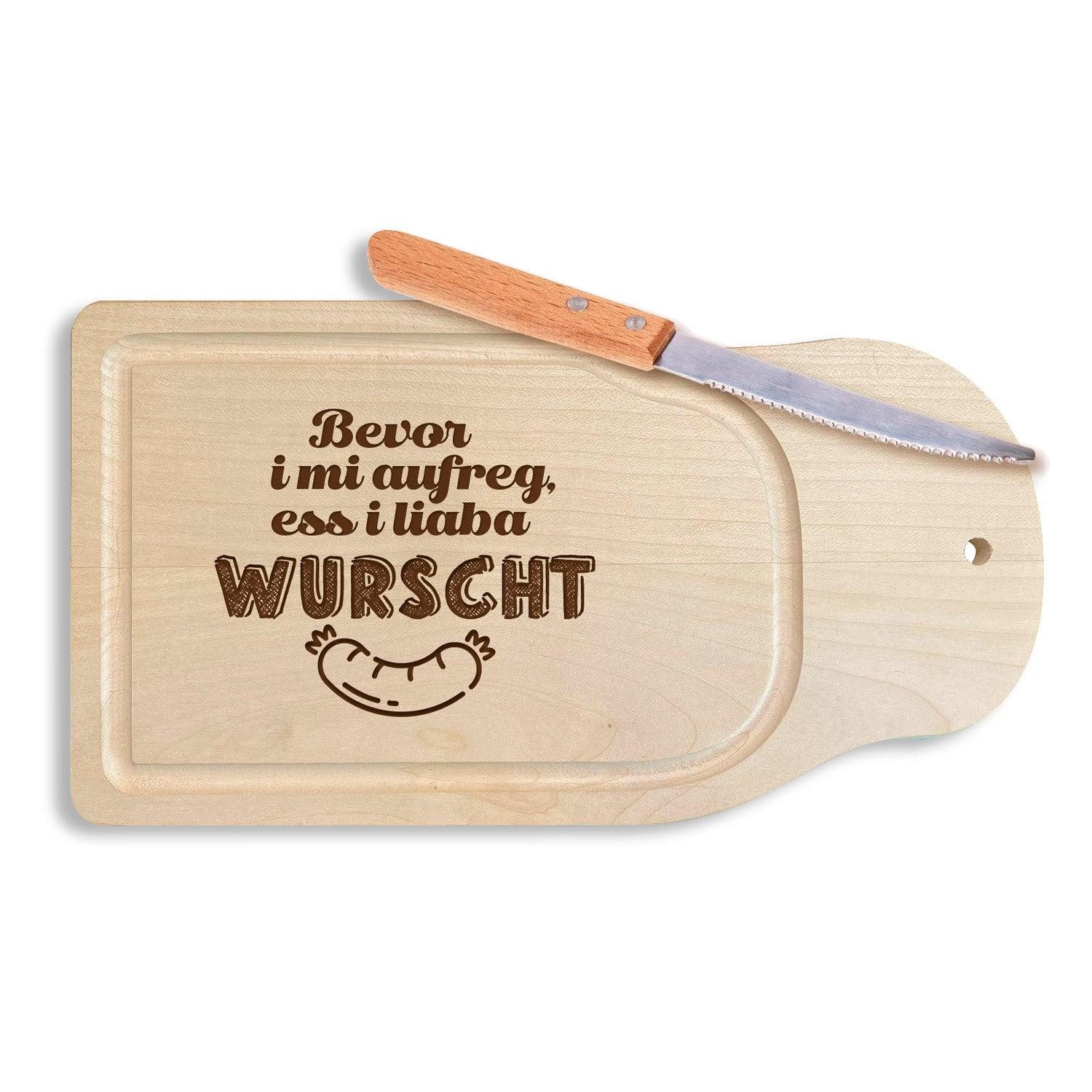 Mit diesem hochwertigen Brotzeitbrettl aus Ahornholz bringst du ein Stück bayerischer Tradition in deine Küche. Der Spruch "Bevor i mi aufreg, ess i liaba WURSCHT" ist nicht nur ein wahrer Leitspruch für alle, die sich gerne entspannen, sondern verleiht deinem Brotzeitbrettl auch eine urige und humorvolle Note. So schmeckt die Brotzeit gleich noch besser und sorgt für gesellige Momente mit Familie und Freunden.