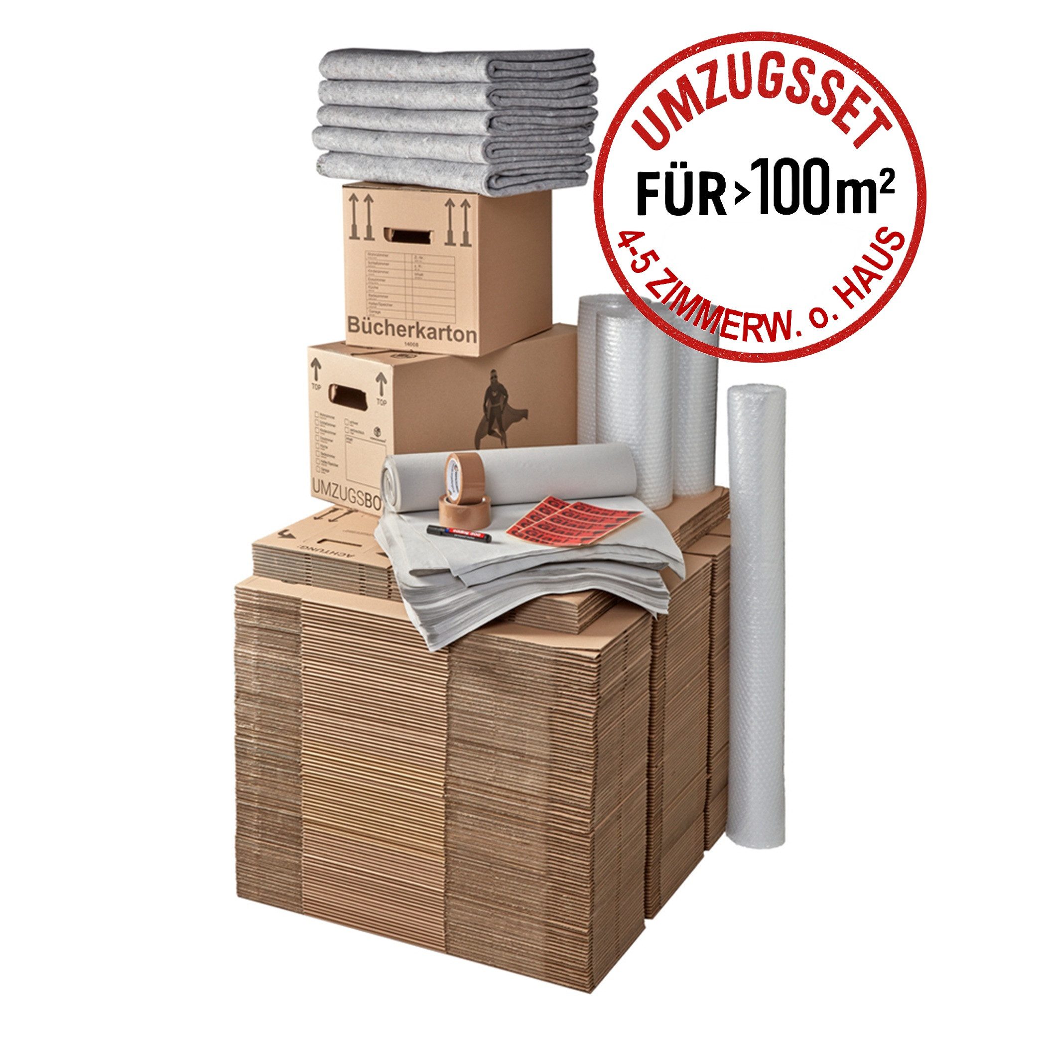 Zu beachten beim Kauf: Unsere Umzugssets wurden von erfahrenen Umzugsprofis zusammengestellt, damit Sie bestens für Ihren Umzug ausgestattet sind. Sie erhalten eine durchdachte Grundausstattung, die Ihnen Zeit, Stress und unnötige Wege erspart. Bitte beachten Sie jedoch, dass der individuelle Bedarf je nach Haushaltsgröße, Wohnungsumfang oder Anzahl der Personen variieren kann – bei Bedarf können Sie Ihr Set jederzeit flexibel ergänzen.