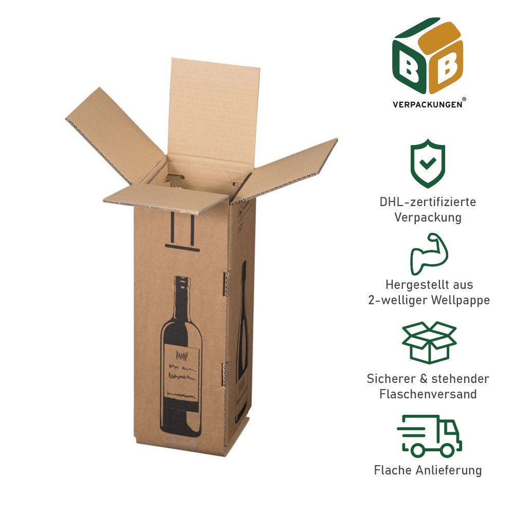 Unser Flaschenversandkarton 1er Magnum ermöglicht Ihnen einen sicheren und problemlosen Transport und Versand von große Flaschen von bis zu 1,5 Liter Fassungsvermögen. Unser Flaschenversandkarton ist DHL zertifiziert und für folgende 1,5l Flaschentypen geprüft: Bordeaux, Burgunder und Sekt.