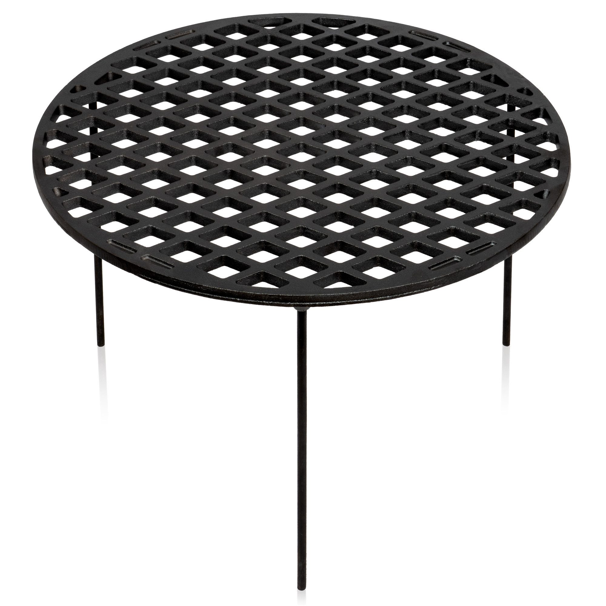 Highlights - Perfekt nutzbar als Grillrost, Dutch Oven Untersetzer und Pfannenknecht - Material Grillrost: Gusseisen - Material Beine: Metall - Gewicht: 10 kg - Außenmaß: Ø 54 x (H) 36 cm - Materialstärke: 1 cm - Die 3 Füße/Beine können an- und abgeschraubt werden - Bereits eingebrannt - kann direkt genutzt werden - Ideal für scharfes und schnelles Anbraten - Kann auch als Untersetzer verwendet werden