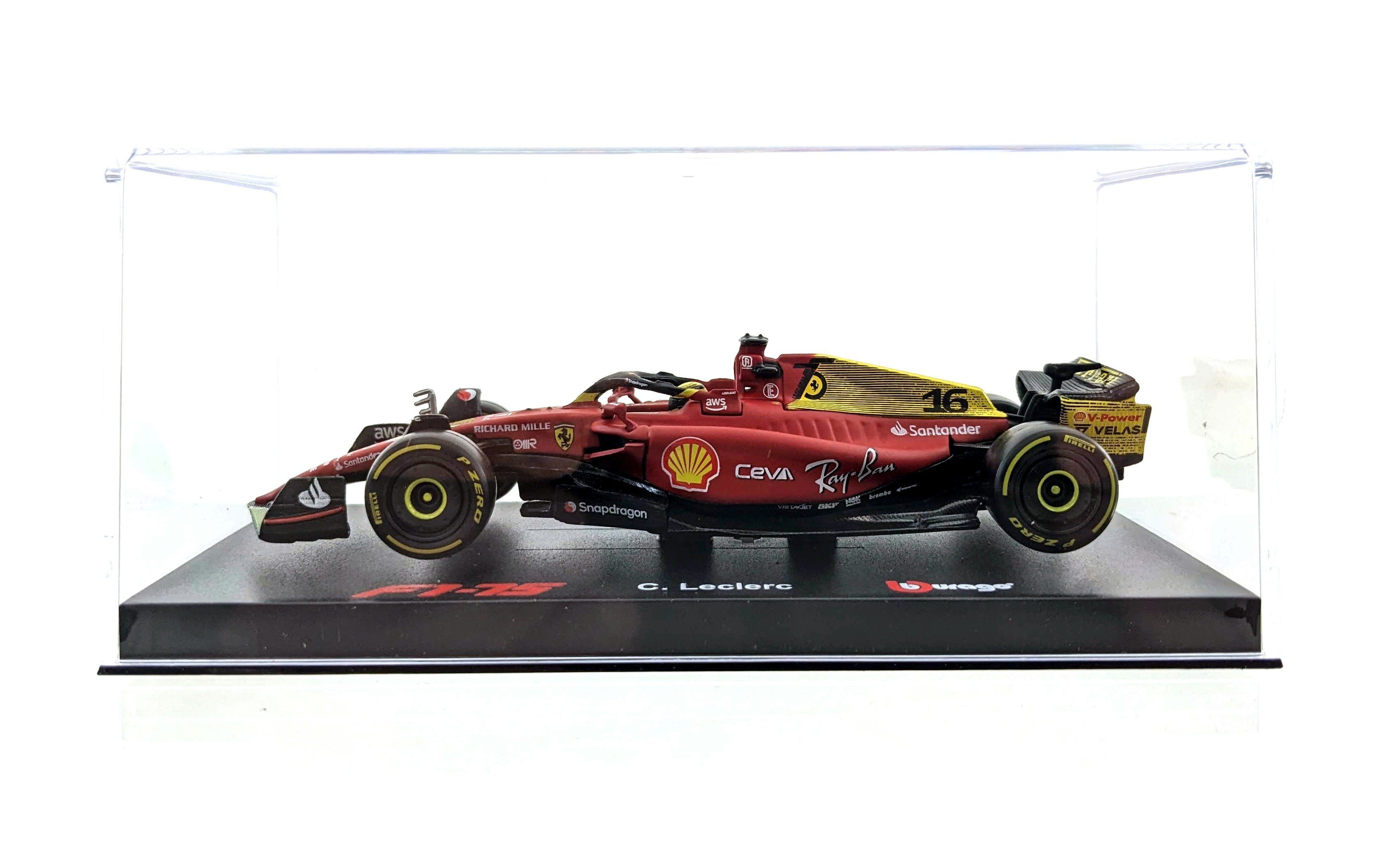 Bburago hat den F1-75 von Charles Leclerc mit der Startnummer #16 jetzt originalgetreu und detailverliebt in der Monza Edition mit dekorativer Acryl-Sammer-Box nachgebildet.