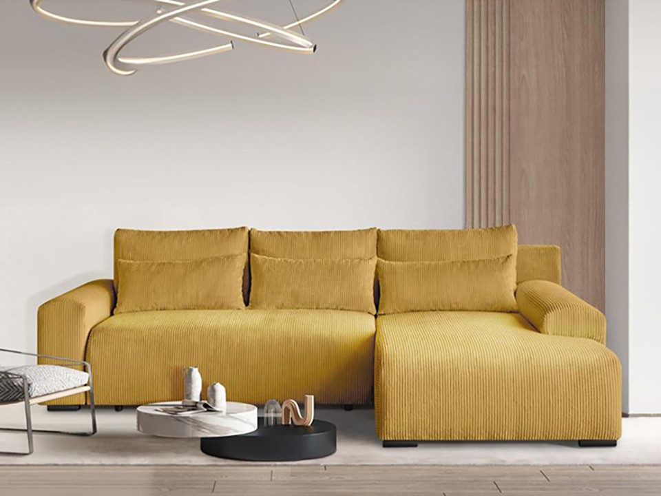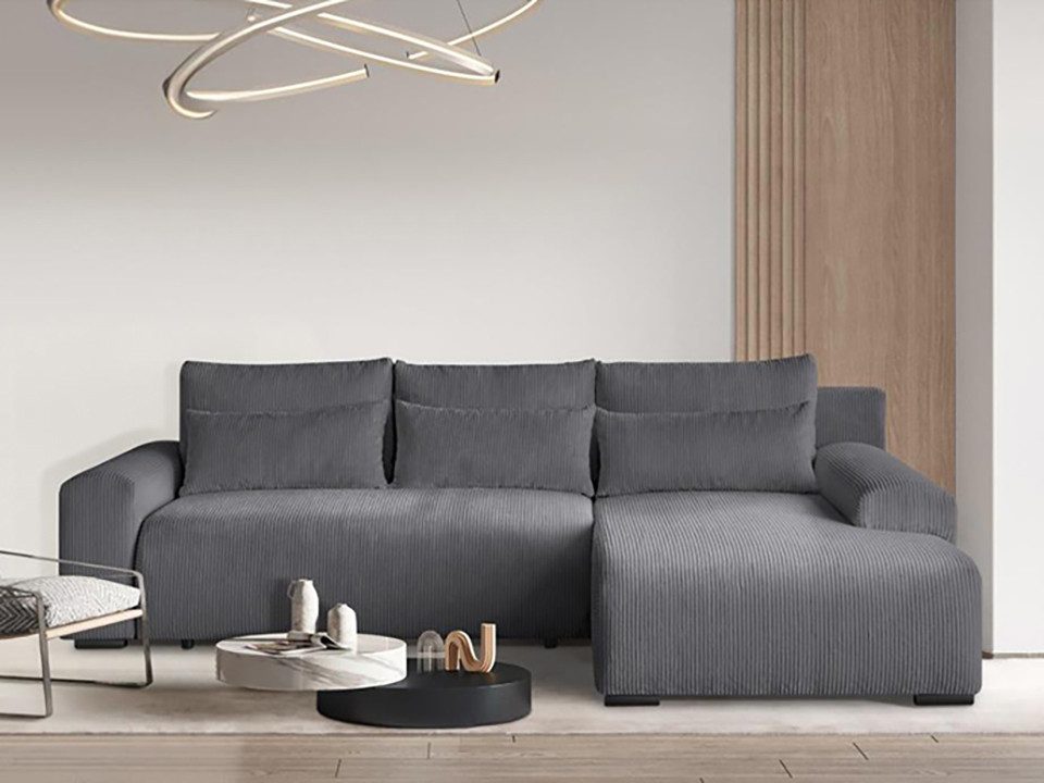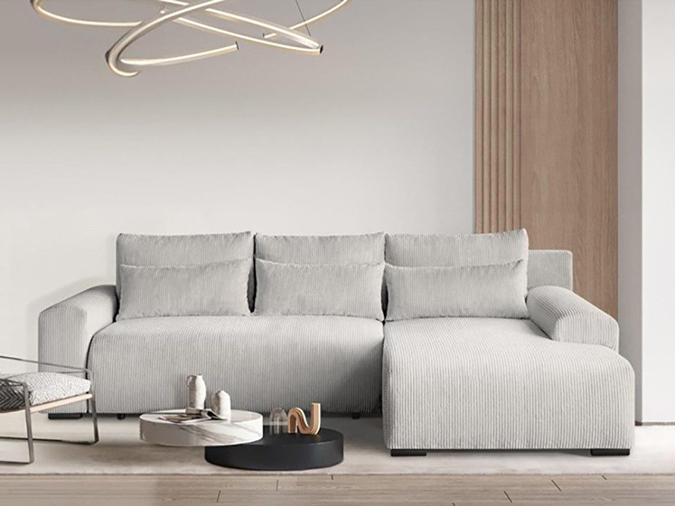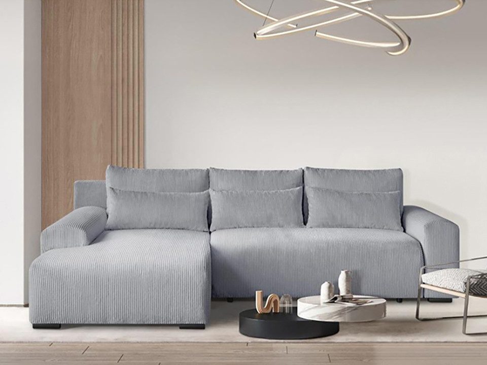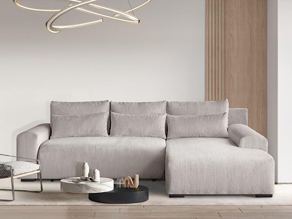 Wir laden Sie ein, ein ungewöhnliches Ecksofa Benny zu entdecken, das außergewöhnlichen Komfort und Funktionalität in Ihr Interieur bringt. Unser L-förmiges Corner Sofa Benny, gepolstert mit 3D-Streifen, ist eine Kombination aus modernem Design und praktischen Lösungen. Einer der wichtigsten Vorteile dieses Sofas ist seine Schlaffunktion mit Liegefläche von 140×218 cm. Auf einfache Weise können Sie es in ein bequemes Bett verwandeln, was es ideal macht, wenn Gäste über Nacht bleiben. Der bequeme Sitz, der auf einer Wellenfeder basiert, bietet nicht nur Komfort während des täglichen Gebrauchs, sondern auch eine hervorragende Unterstützung für Ihre Wirbelsäule. Es verfügt über einen Bettwäschebehälter, der diskret im Inneren des Möbels versteckt ist. Nicht nur Bequemlichkeit, sondern vor allem Praktikabilität – das sind die Merkmale des stilvoll Ecksofas Benny.